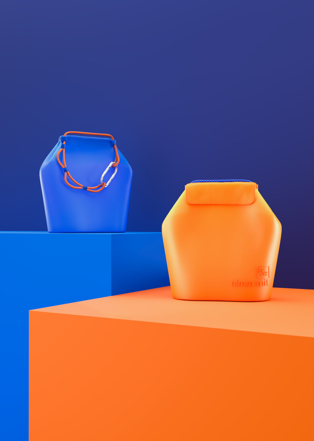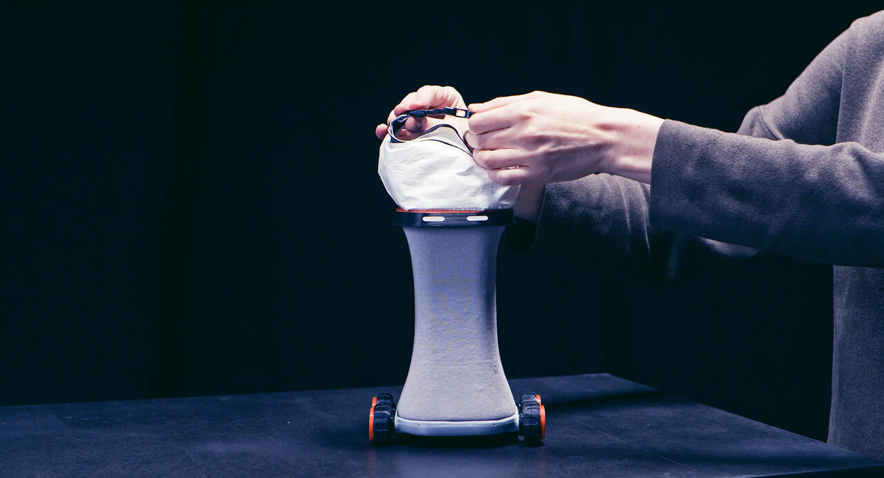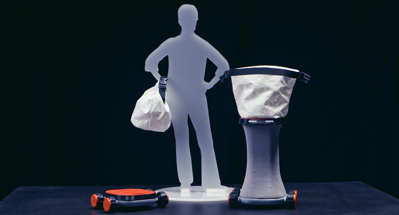 Um das Entsorgen von Biogut komfortabel zu machen, sollte seine Entsorgung an bestehende Routinen – wie den Weg zur Arbeit – gekoppelt sein. Wurde Bioabfall bislang zu den Müllplätzen im Hinterhof gebracht, wird er künftig an Sammelstellen im öffentlichen Raum entleert. An zentralen Wegen stehen dafür Tonnen bereit, die von allen befüllt werden können. Im Haushalt wird der Bioabfall in dem Behältnis nimm mit gesammelt: nimm mit ist ein flexibler Beutel aus Silikon mit einem Fassungsvermögen von 1,2 Litern. Der Beutel steht frei. Mit Magneten an seiner Öffnung lässt er sich sicher verschließen und kann an einer Kordel getragen werden. An der Sammelstelle lass hier setzen die Magnete am Einwurf der Tonne an; der flexible Beutel wird sodann gestülpt und hygienisch entleert. Anschließend lässt sich der Beutel wieder magnetisch schließen und findet zusammengerollt in jeder Tasche Platz. Karabiner sichern den Verschluss, so dass nimm mit auch auslaufsicher ist. Zurück im Haushalt lässt sich der Beutel einfach auf links drehen und für die Weiterverwendung reinigen.