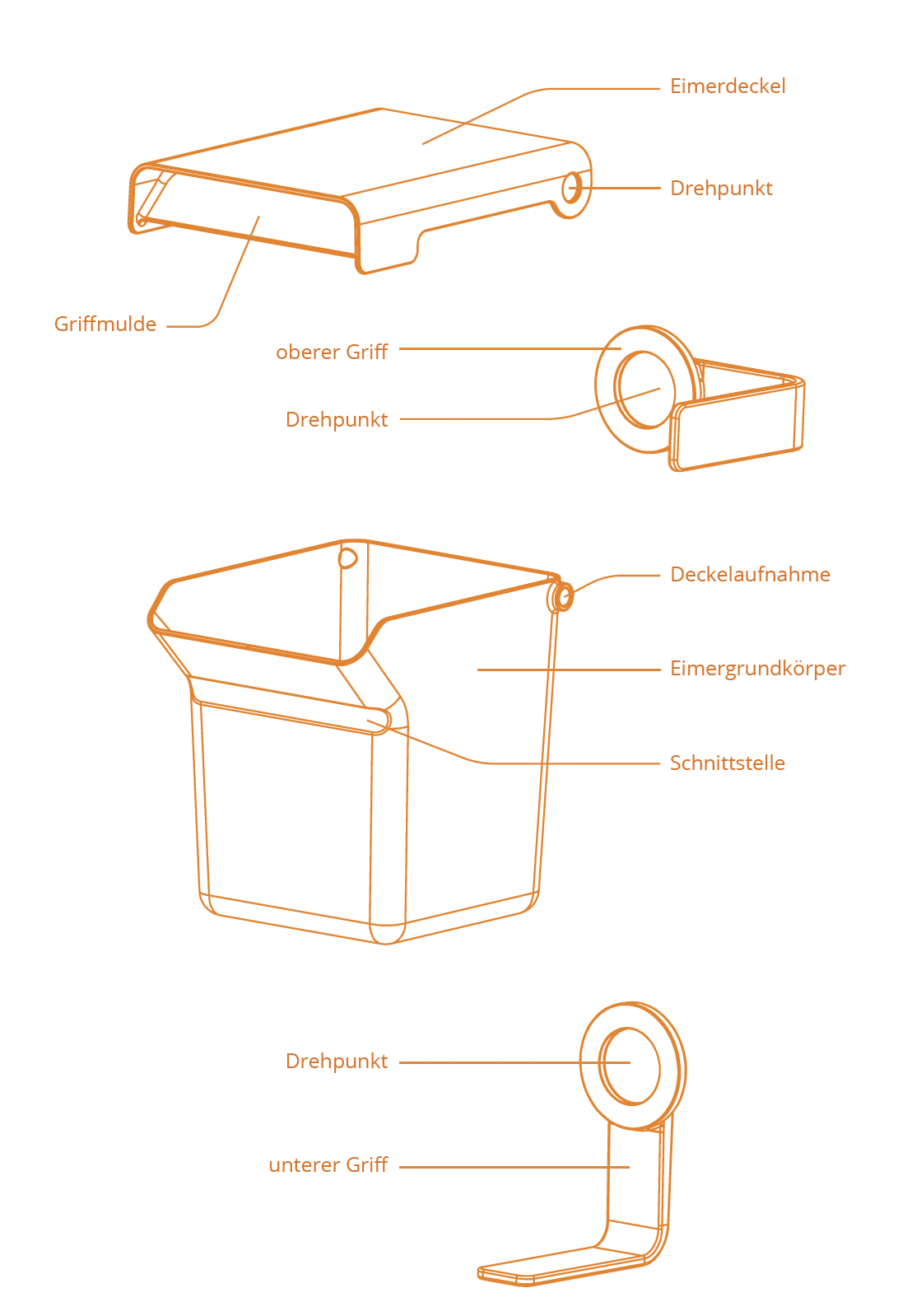 Der Bioeimer KIPPO ist genau dafür gebaut. Mit seinem quadratischen Grundriss fasst er etwa 7 Liter. Das Besondere sind zwei starke, winkelförmige Griffe: Der obere Griff kreist von den Eimerseiten über den Deckel; der untere kreist bei Bedarf über den Eimerboden. Mit ihnen kann der Eimer getragen, gehalten und auch gekippt werden. Dank der Stärke der Griffe kann man sich vom Eimerinhalt bestens distanzieren.