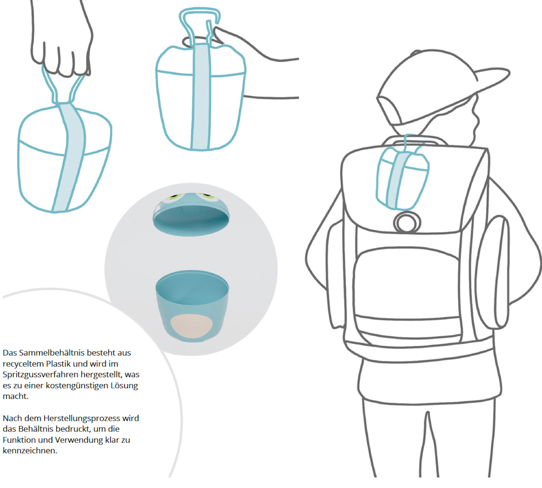 Die Nutzung von cocon lässt sich auch in anderen Kontexten denken. Der Beutel kann einfach in die Küche gestellt, an die Küchenwand gehängt oder sogar mit in den Park genommen werden, um beim Picknick den Müll zu sammeln. Der Beutel ist auch in anderen Größen denkbar, um sich an die Bewohner anzupassen, und bietet ihnen die Möglichkeit für gemeinschaftliches Engagement, wo Nachbarn sich beim Entleeren abwechseln könnten. In einer Stadt der Zukunft könnte cocon in andere Müllsysteme integriert werden.