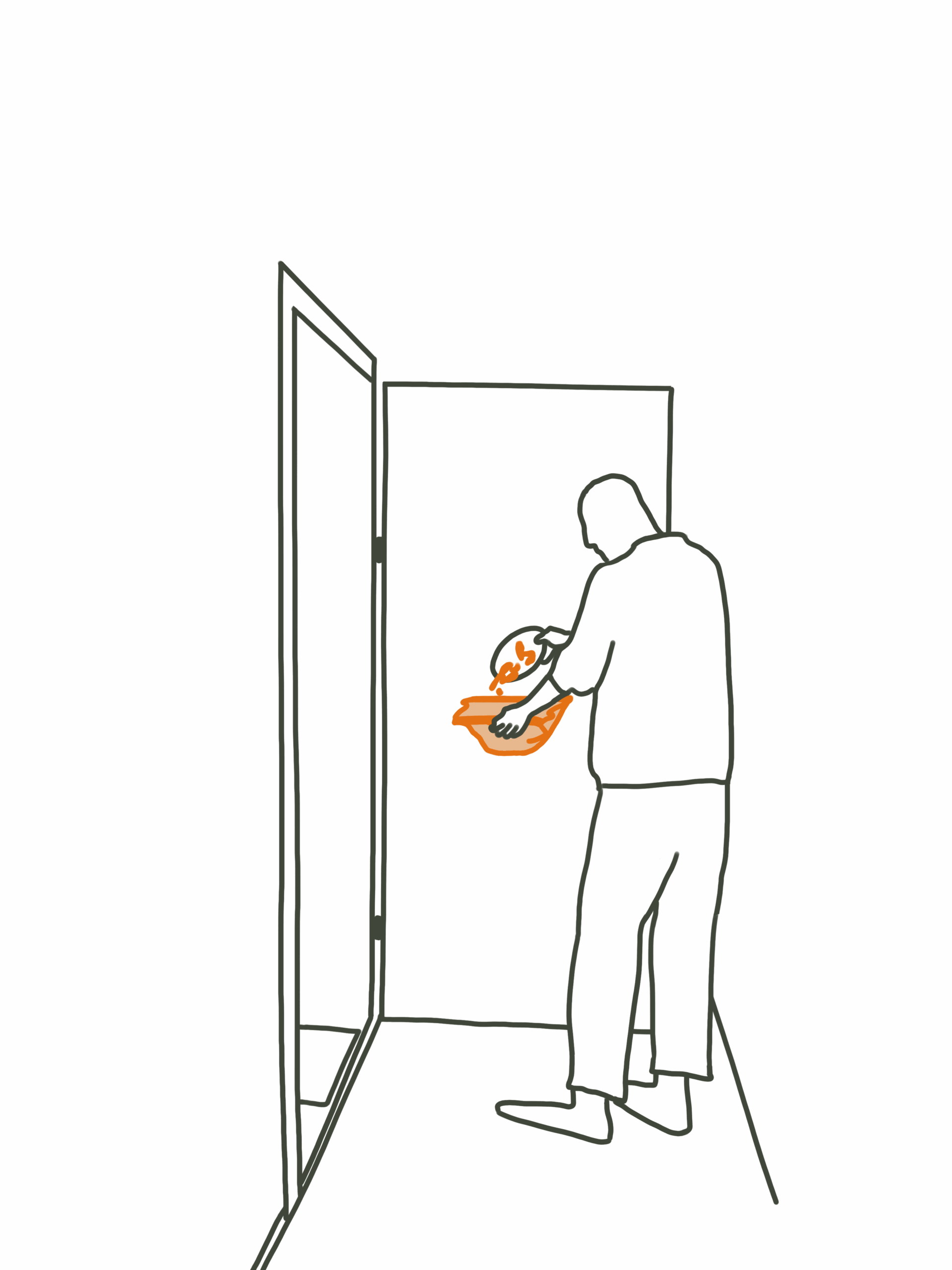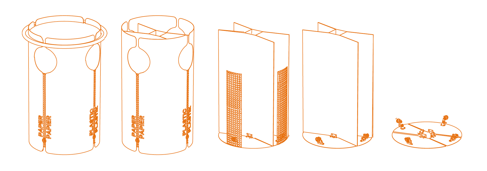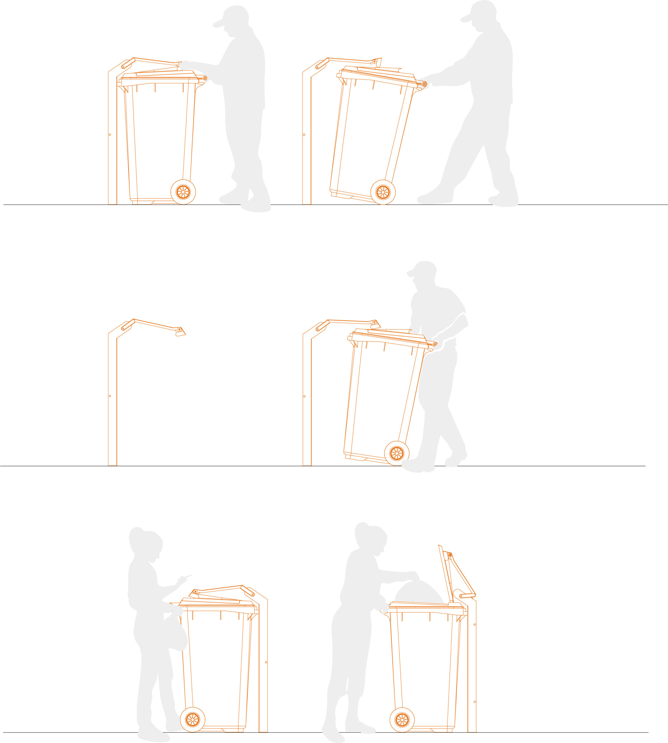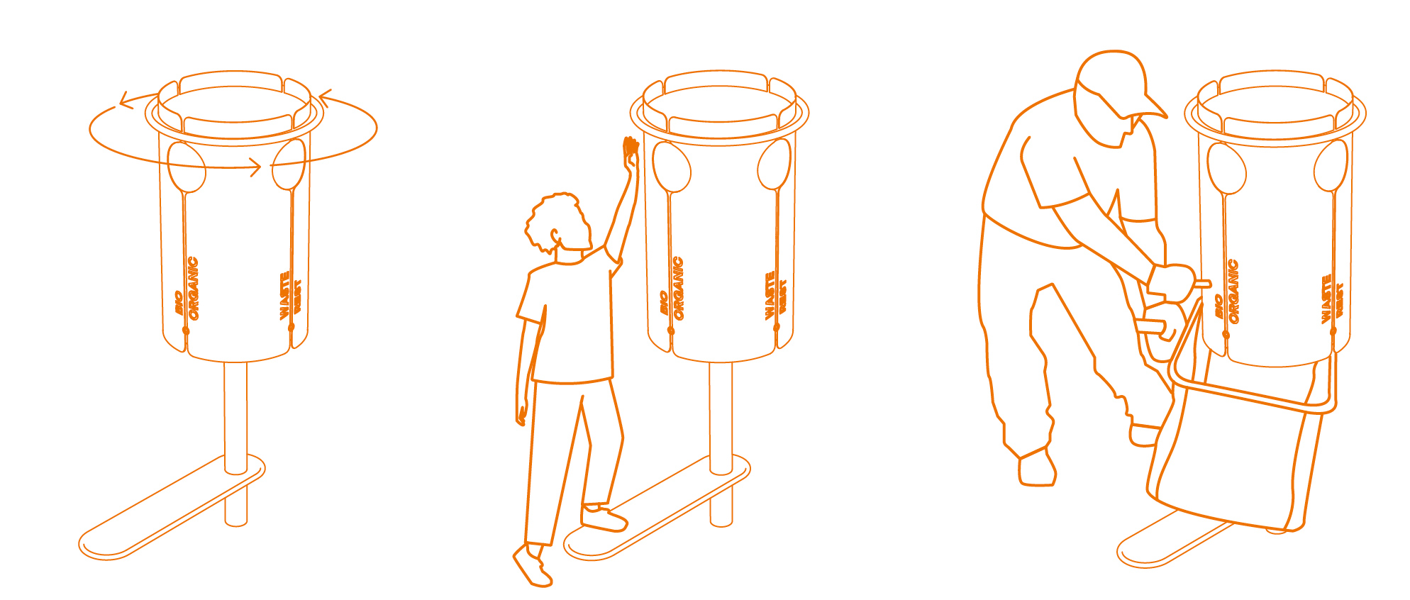 Ließe sich der unbequeme Mehraufwand für Biomüll nicht irgendwie verhindern? bin:CYCLED ist ein Kreislaufsystem, das Bioabfall durch eine bequeme Sammellösung in die Routinen des Alltags integriert. An zentraler Stelle zum Hauseingang werden Behältnisse bereitgestellt, die nutzbar für das Sammeln von Biomüll sind. Sie können von den Bewohnern kostenfrei mitgenommen werden und fassen die Biomüllmengen von etwa zwei Tagen. Sind diese Behältnisse mit biologischem Abfall befüllt, werden sie beim täglichen Verlassen des Hauses mitgenommen und unkompliziert in die entsprechenden Tonnen entleert. Direkt bei den Tonnen können die Behältnisse an der Abgabestelle zurückgegeben werden. Beim nächsten Heimkehren nimmt man einen frischen Behälter in die Wohnung mit. Es entsteht ein Kreislaufsystem aus Mitnehmen, Sammeln, Entsorgen und Abgeben. Durch das regelmäßige Entleeren bilden sich im organischen Abfall weder Geruch, noch Schimmel, noch Fliegenbefall. Die Hausverwaltung der Großsiedlungen sorgt für regelmäßige Reinigung und für die Instandhaltung der Behältnisse.