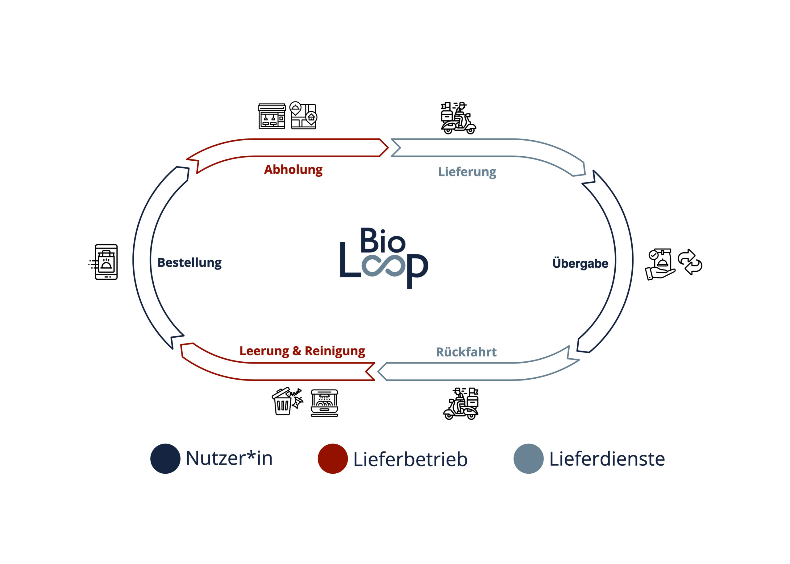 Das Entsorgen organischer Abfälle ließe sich mit wenig Aufwand über die Leerfahrten von Lieferdiensten in bestehende Kreisläufe integrieren. BioLoop ist eine Lösung für Menschen, die zwei bis drei Mal in der Woche Lieferdienste in Anspruch nehmen und die bisher keinen Biomüll trennten. Im Konzept wird der anfallende Bioabfall im Deckel von leeren Mehrwegbehältern gesammelt. Diese Behälter werden bei der Rückführung entleert und gereinigt. Die Entsorgung von Biomüll wird für die Nutzer:innen durch die Abholung oder Rückgabe unaufwändig und bequem.