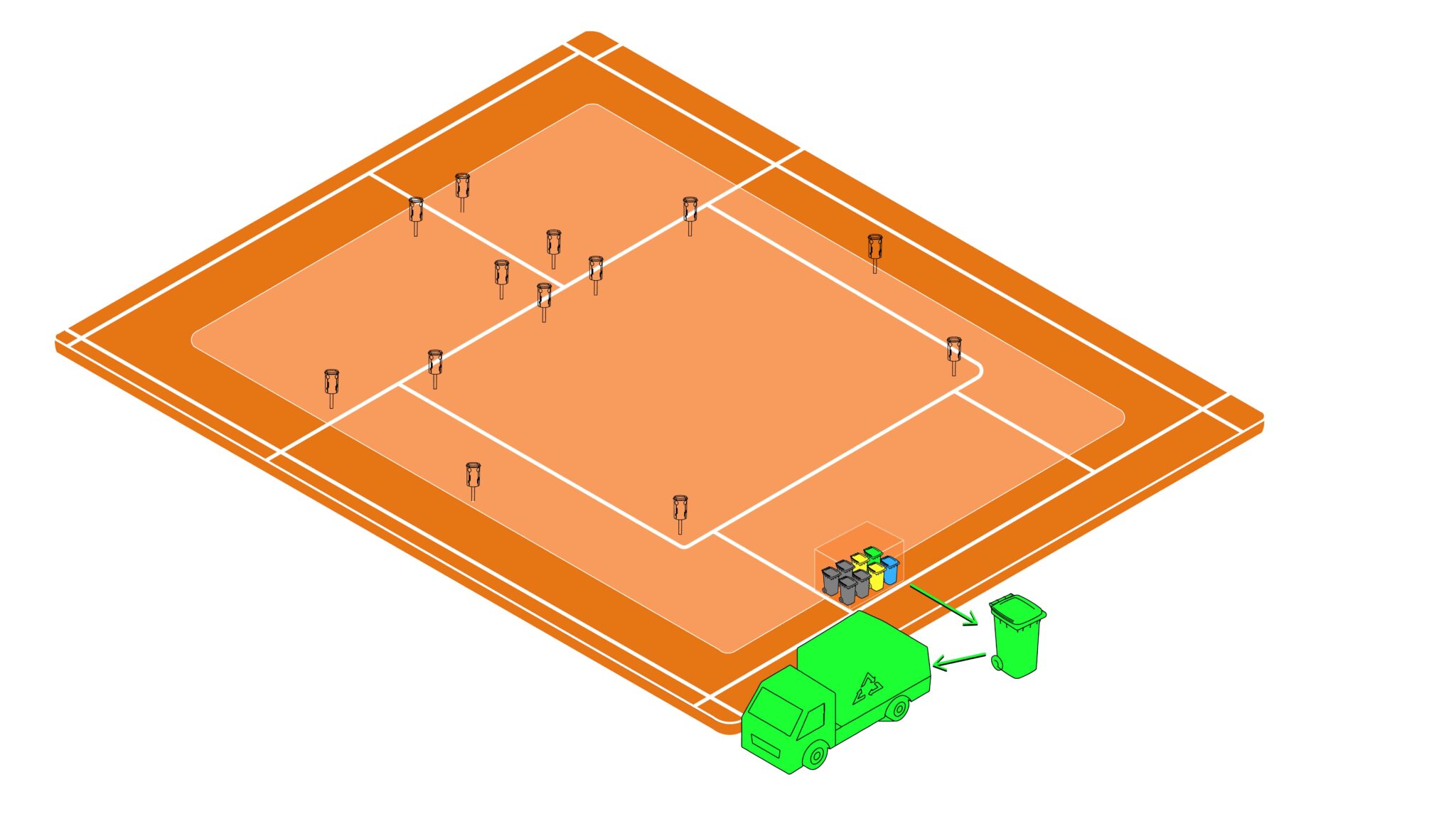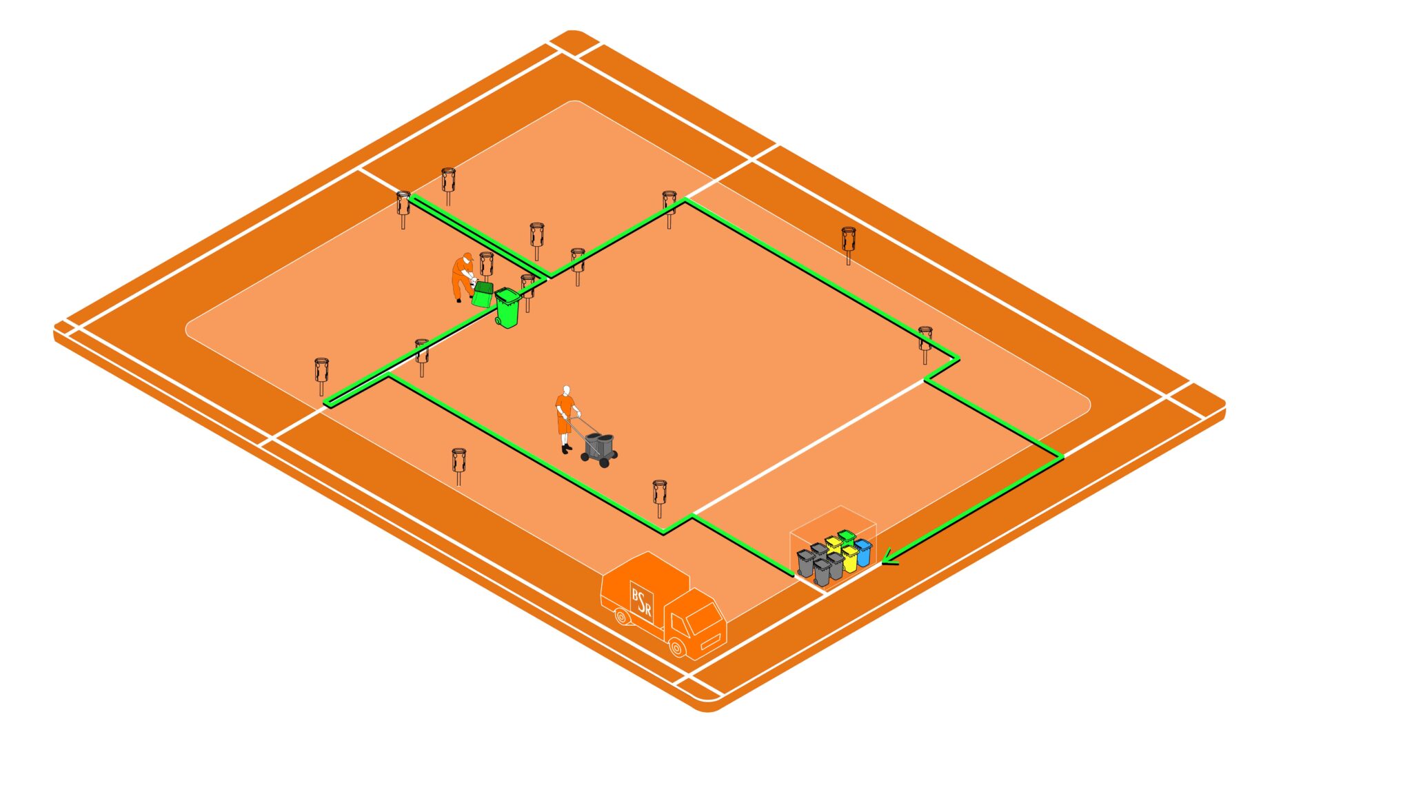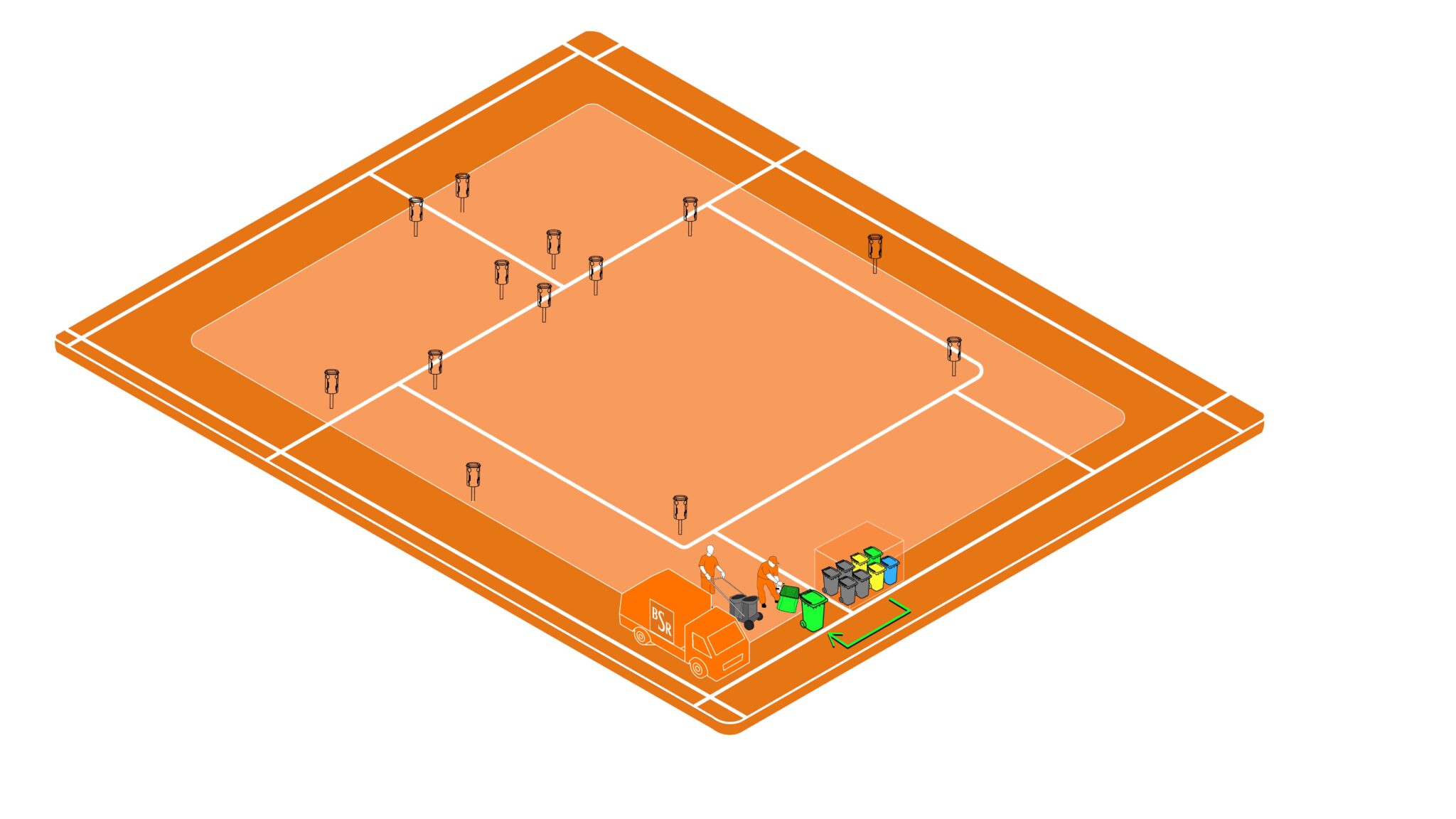 Besonders herausfordernd ist die Entsorgung der vier Abfallsorten durch die Stadtreinigung. Das Prinzip ist bekannt: Der Mülleimer entleert sich über eine der vier Bodenklappen. Entsprechend der anfallenden Müllmengen werden die Abfallfächer unterschiedlich häufig entleert. Die Erträge der Leerungstouren werden an geschlossenen Sammelstellen mit Müllgroßbehältern in Parknähe – den SR-Hubs – aggregiert. Diese Hubs sind auch die Schnittstelle für die Stadtreinigung und die drei verschiedenen Müllabfuhrunternehmen der Stadt.