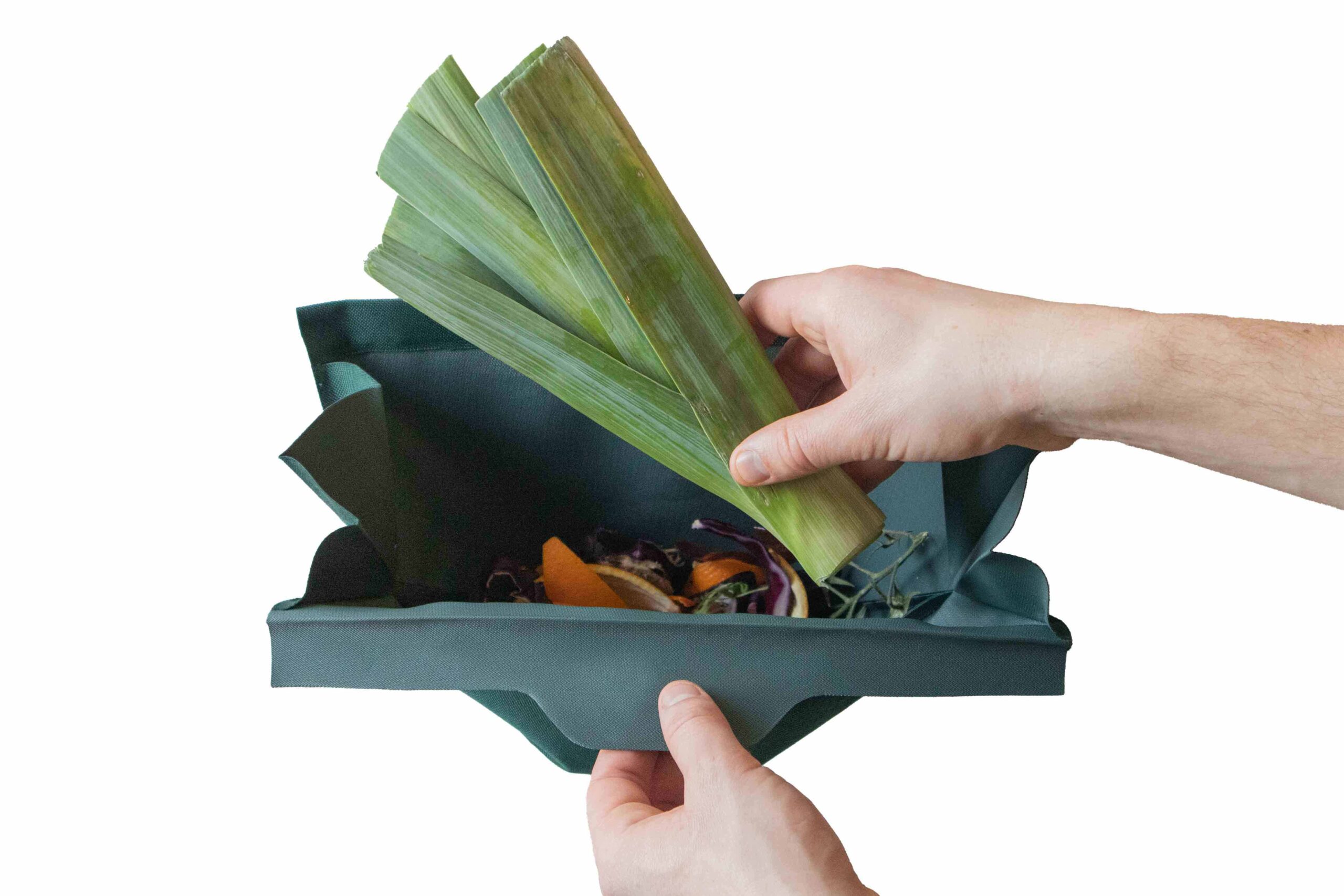 Um die Hemmschwelle zum Trennen zu senken, wird das Sammelbehältnis in den Hausflur verlegt. An jeder Wohnungstür gibt es für Biogut nun einen Textilbeutel: Dieser wird an einer Magnetleiste an der Tür eingehängt. Mit dem Öffnen der Wohnungstür schwenkt der Sammelbeutel kurz in den privaten Raum, was das Entsorgen komfortabel macht. Wird an der Lasche des Beutels gezogen, öffnet sich der magnetische, luftdichte Verschluss und die vordere Lippe des Beutels entfaltet sich in Richtung des Nutzers. Dadurch wird die Einwurföffnung groß. Die Faltung des Beutels ermöglicht ein Füllvolumen von zwei Litern. Später kann der Beutel einfach mit einem Zug an der oberen Kante von der Leiste abgenommen werden. Zum Entleeren hält man ihn einfach an der vorderen Lasche fest. Durch das Gewicht des Inhalts öffnet er sich automatisch und der Bioabfall fällt in die Biotonne. Im Anschluss kann er in der Waschmaschine gereinigt oder einfach mit der Hand abgespült werden.