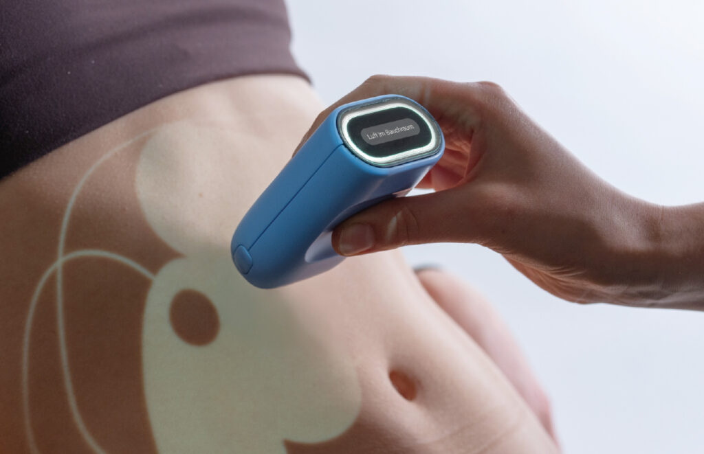 Während des Scans erkennt das System die Auffälligkeit Luft im Bauchraum. Eine Markierung erscheint auf dem Körper, die den betroffenen Bereich markiert.