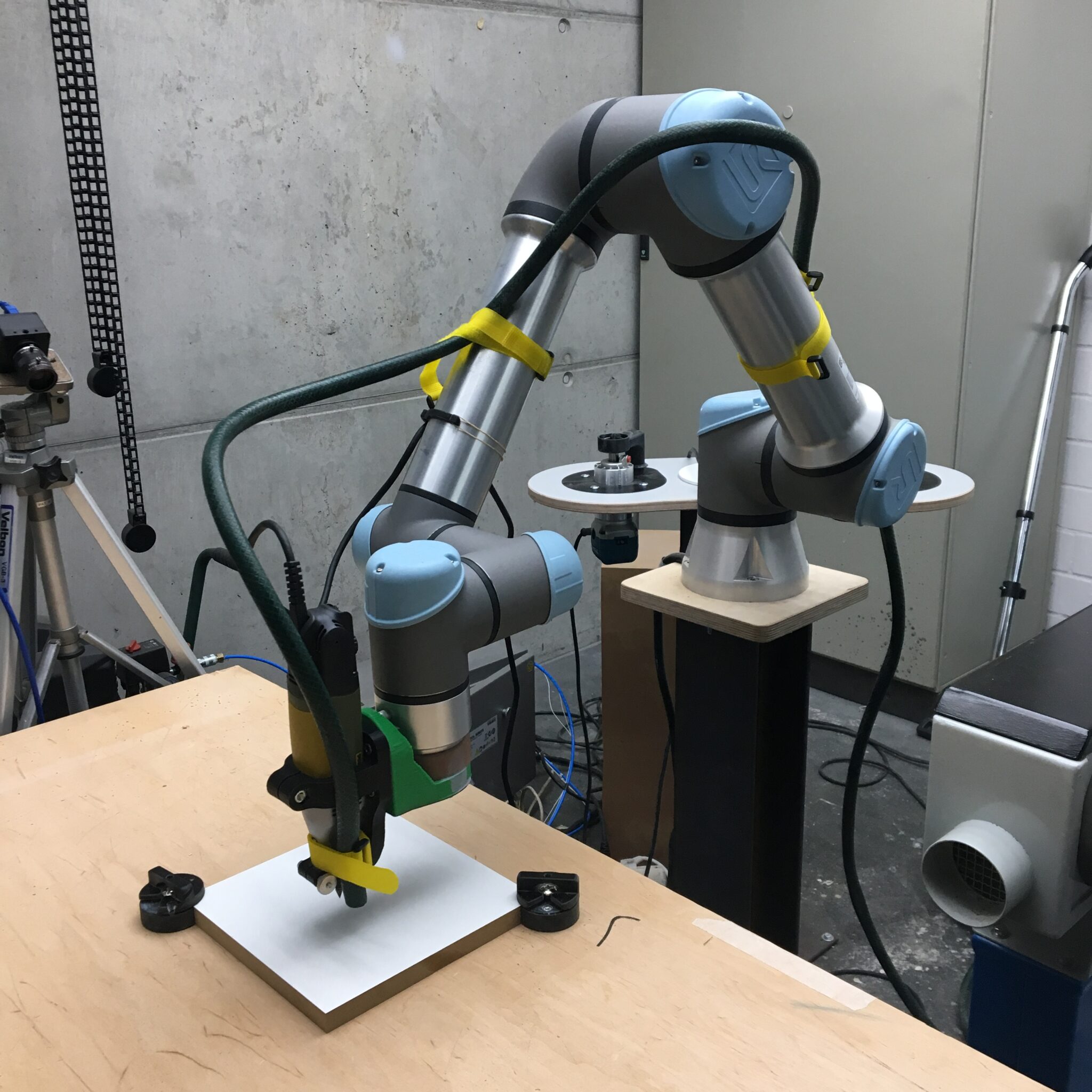 Im Fokus stand die Frage, wie eine künstlerisch-gestalterische Lehre mit digitalen Technologien gestaltet werden kann, die hybride Lernräume nutzt und die Werkstattarbeit ins Zentrum stellt. Besonders wichtig war ein niederschwelliger Zugang für Studierende ohne Vorwissen oder technologisches Selbstvertrauen. Das physische Zentrum bildet die Rapid Prototyping Werkstatt mit zwei 6-achsigen Roboterarmen (UR5e). Studierende erforschen hier, wie ein Roboterarm als Ausgangspunkt für iterative gestalterische Experimente dienen kann. So entstand ein hybrider Lehr- und Lernraum, in dem analoges und digitales Arbeiten ineinandergreifen.