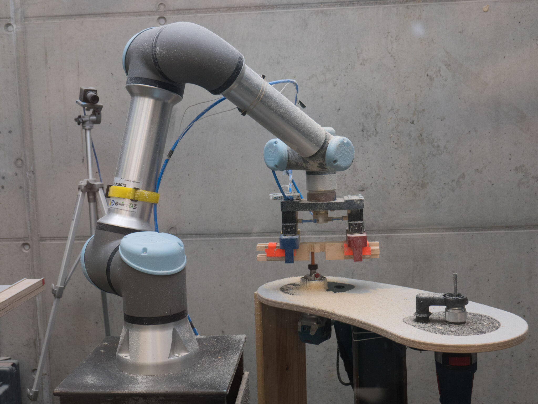 Robotisches Setup für gefräste Holzverbindungen mit verschiedenen Werkzeugstationen