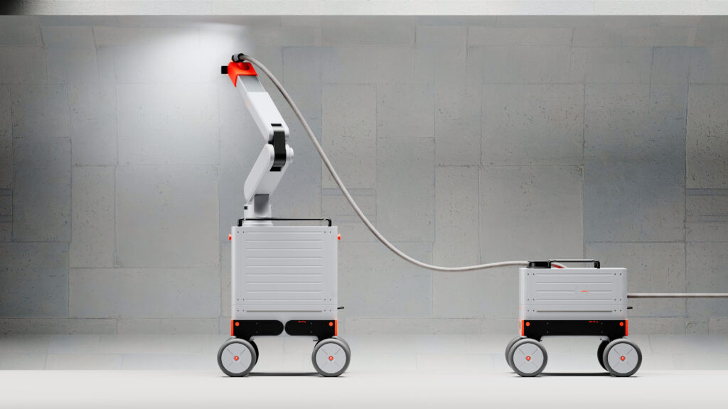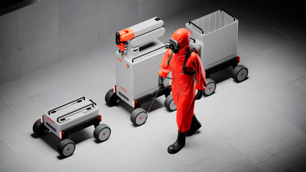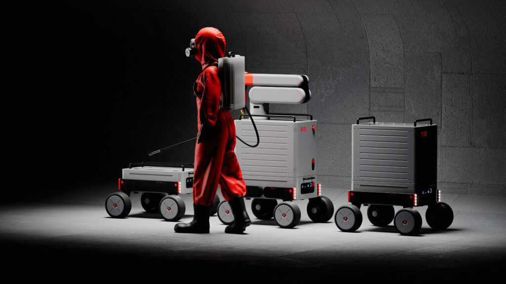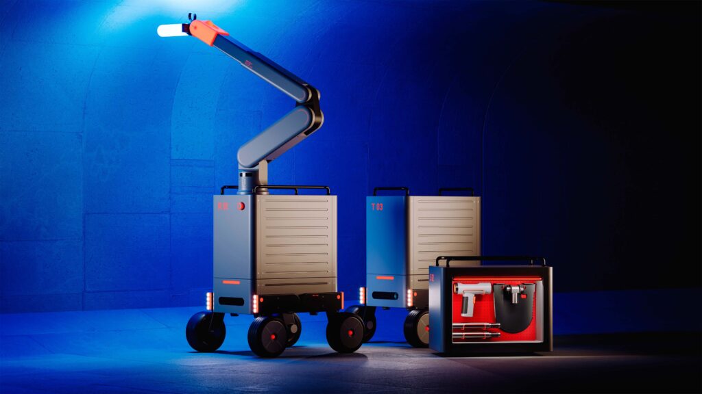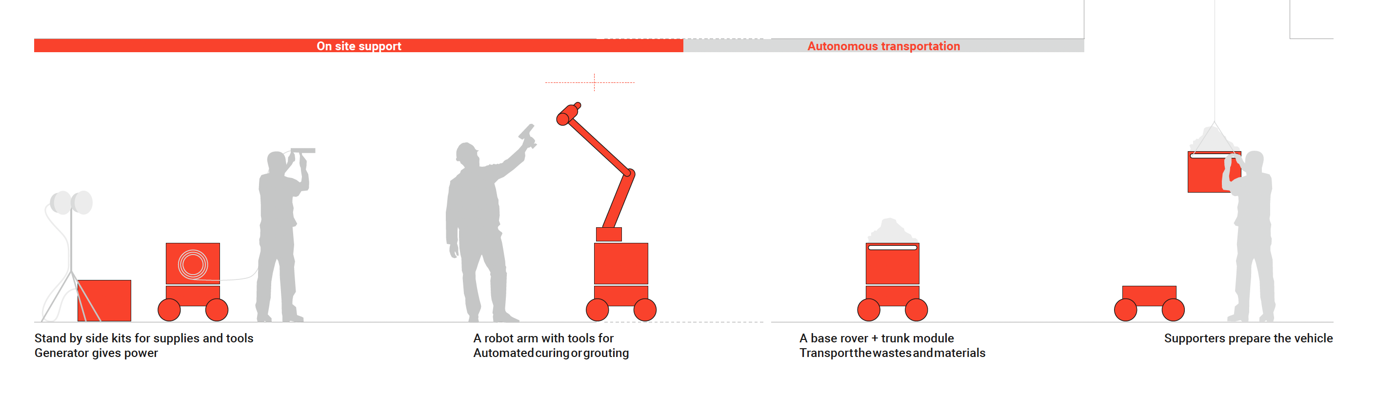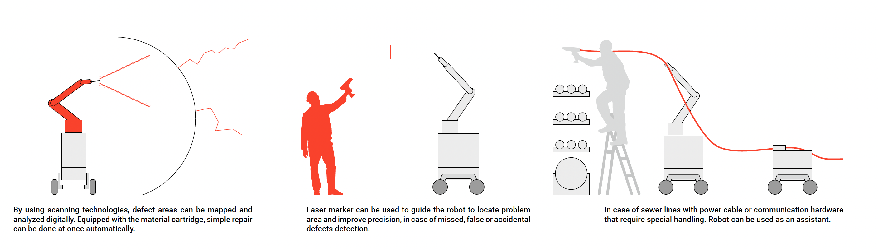 SEWER 4.0 NEUER ARBEITSABLAUF UND NEUE KONFIGURATIONEN: Mit diesem Konzept ist eine neue Konfiguration für die Kanalwartung möglich. Die Bediener verfügen über Standby-Kits, die eine größere Auswahl an Werkzeugen bieten. Ein Roboterarm mit Werkzeugen automatisiert den Aushärtungs- oder Verpressungsprozess. Eine autonome Transporteinheit beschleunigt den Transport und verbindet sich mit den Unterstützern am Eingang.