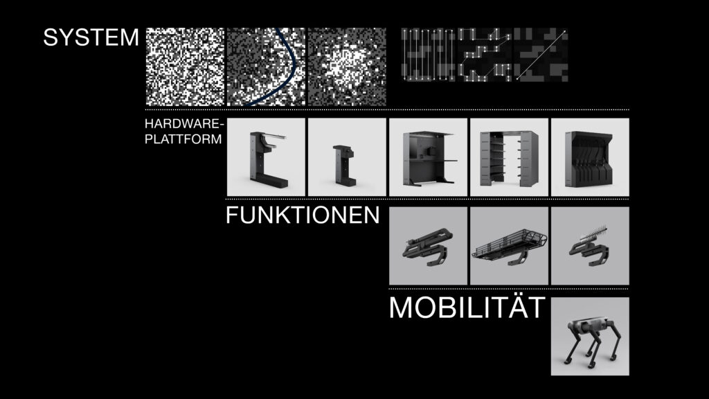 Hardware-Plattform: Roboter-Module werden per Schnellverschluss auf einer Halterung montiert. Über Code-Erkennung positioniert der Roboter Station und Ladegerät Tag und Nacht und prüft deren Zustand. Rahmen und Sockel sind modular anpassbar.