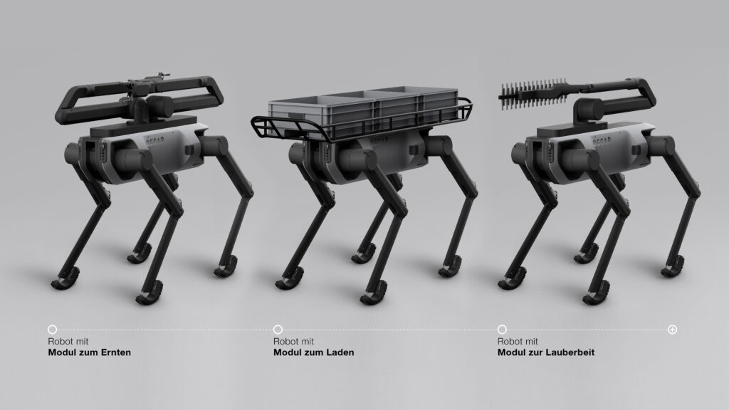 Funktion: Für höhere Effizienz erntet ein Roboter mit zwei Greifern, während ein anderer transportiert. Ein Kistenträger fasst bis zu drei 50-Liter-Kisten und kann auch für andere Werkzeuge genutzt werden.