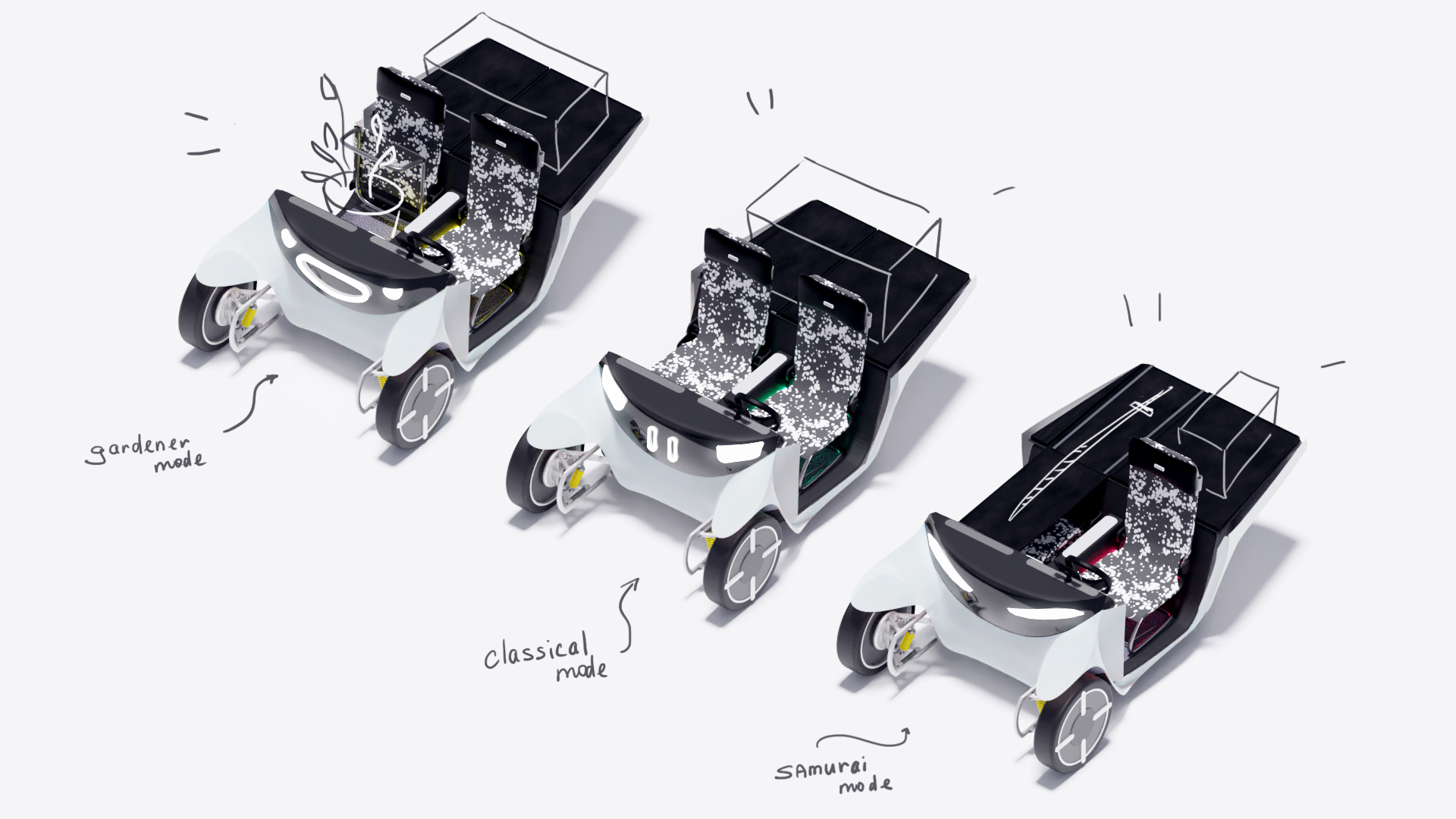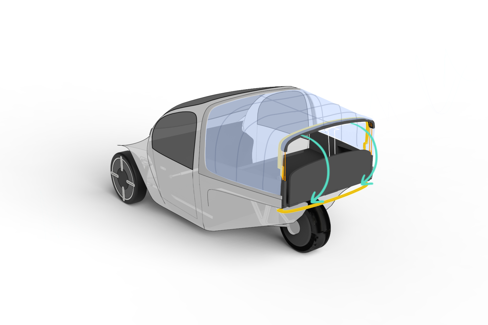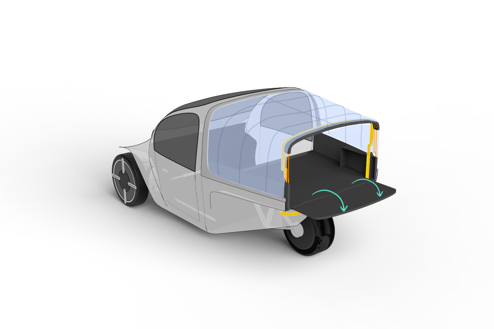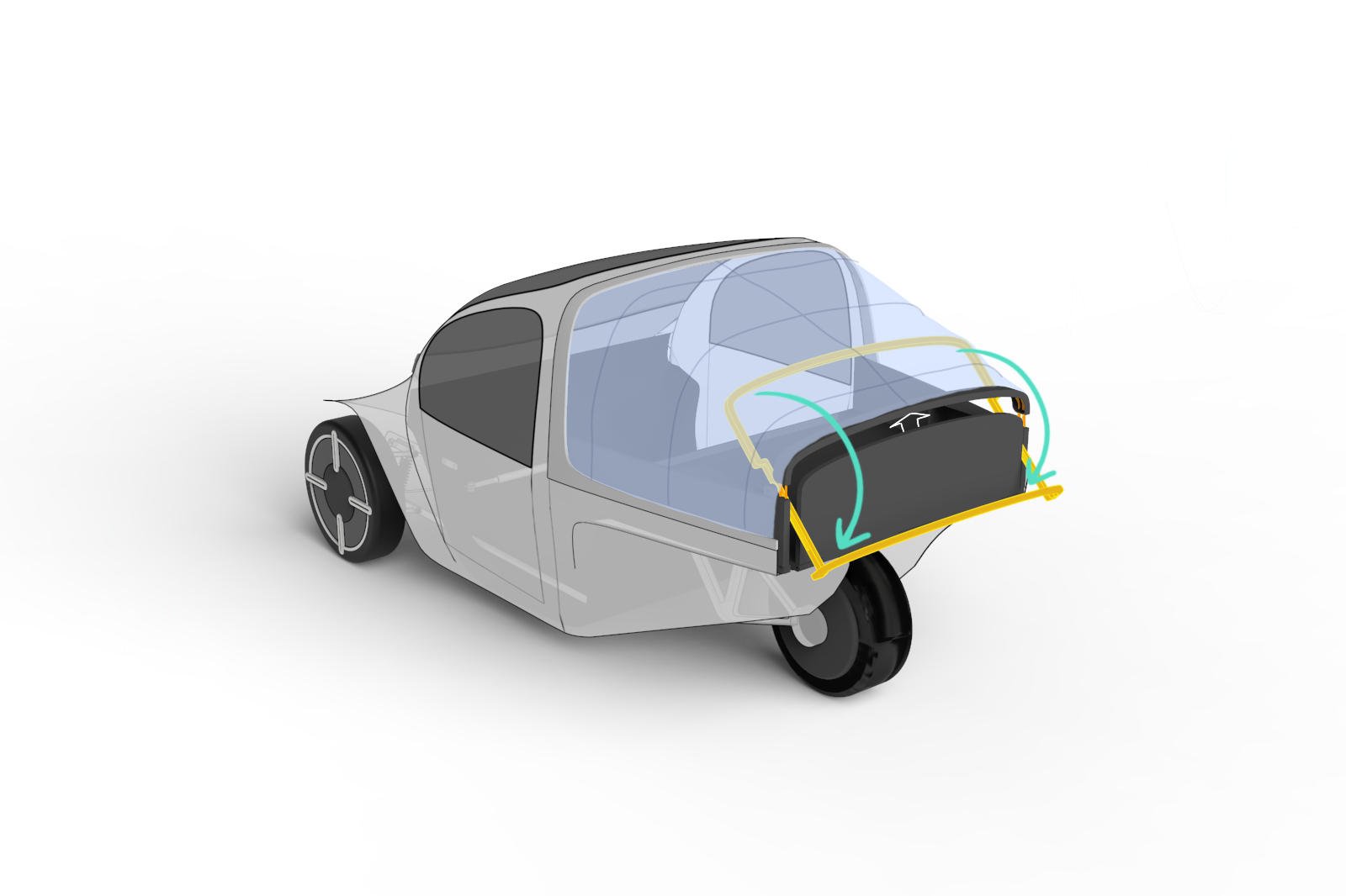 Das progressive Schlüsselmotiv lautet »Low-Material«. Humbly ist ein dreirädriges E-Vehikel für bis zu zwei Personen. Beinahe erinnert es an einen Scooter oder Cart. Mit textilgedeckter Karosserie gerät Humbly zum wind- und wettergeschützten Leichtgewicht. Anstelle gängiger Rücksitze offeriert Humbly Stauraum für verschieden große Lasten – wird der Beifahrersitz umgeklappt, vergrößert sich die Ladefläche um Längen. Beladen wird Humbly rückseitig: Ein aufstellbarer Klappbügel vergrößert die Öffnung der überdachenden Plane.