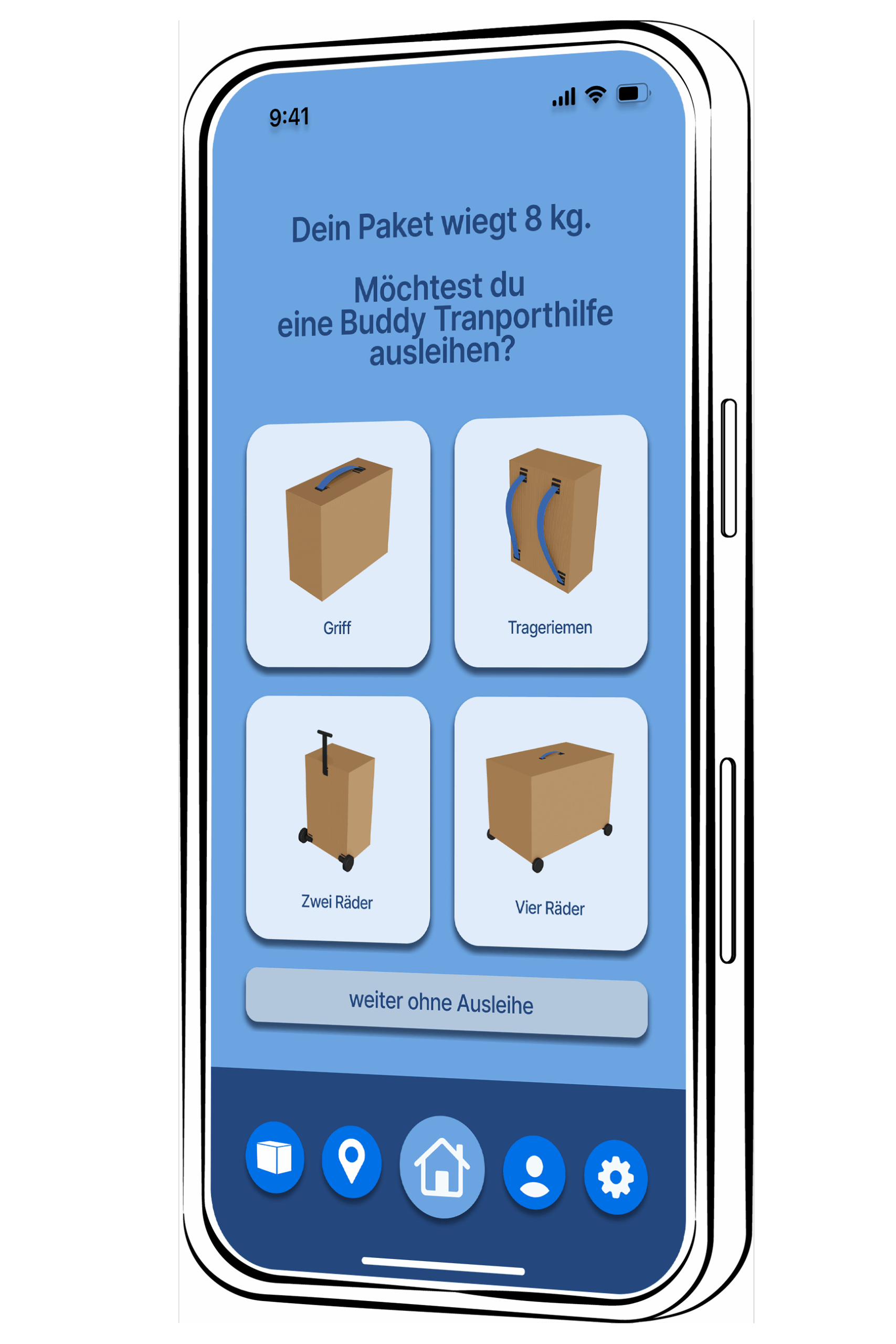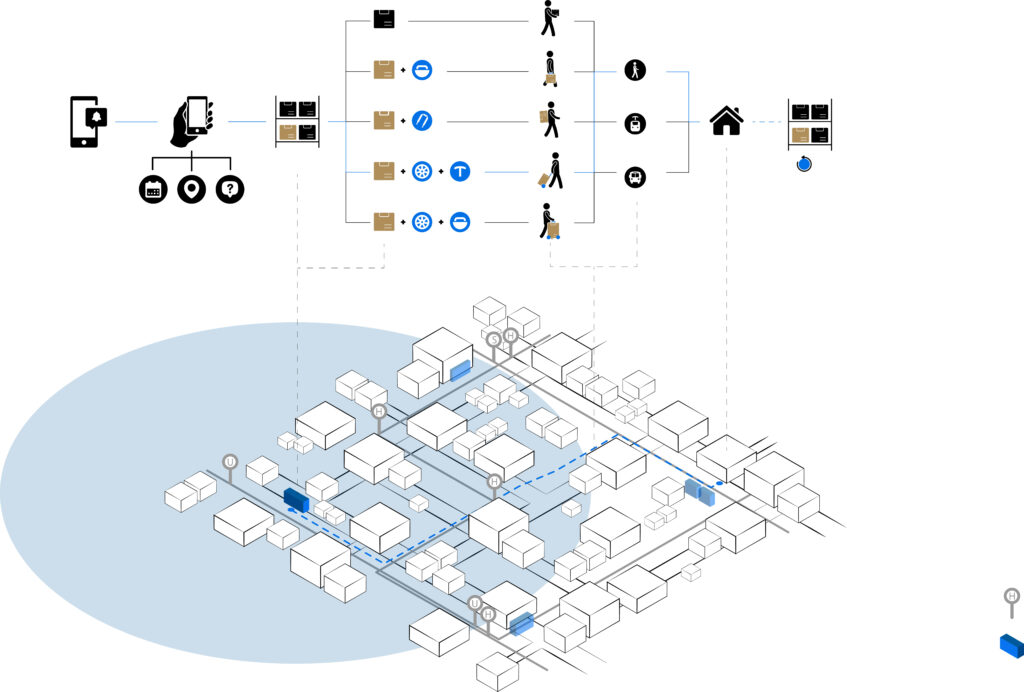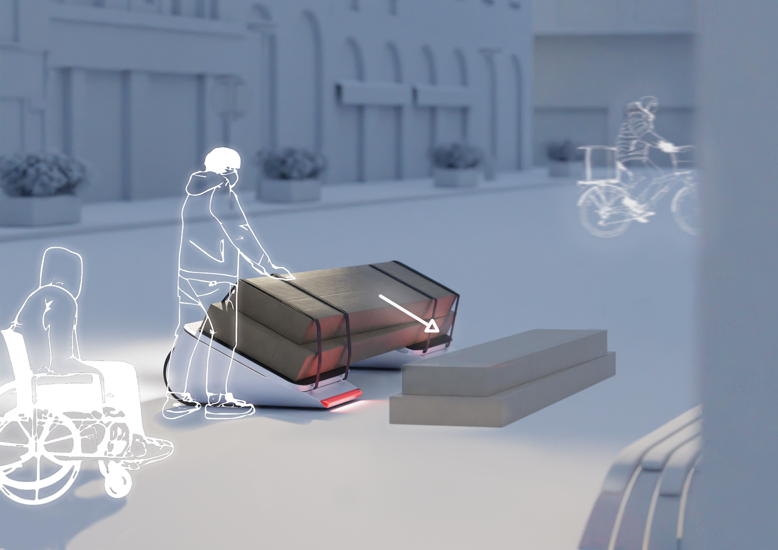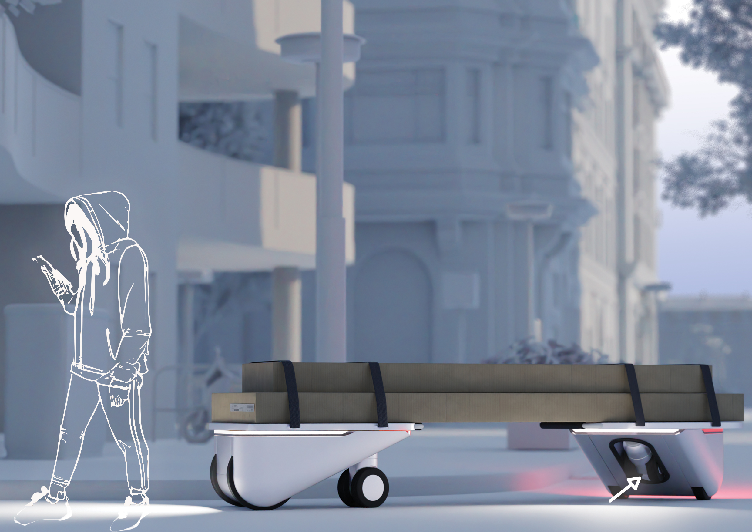 Über einen digitalen Service kann die passende Abholstation ausgewählt werden. Für barrierefreies Abholen können Körpergröße oder andere physische Bedingungen via App angegeben werden. Mit diesem einfachen System von Transporthilfen wird die letzte Meile neu gedacht. Zustellfahrzeuge werden überflüssig und der städtische Verkehr erheblich entlastet.