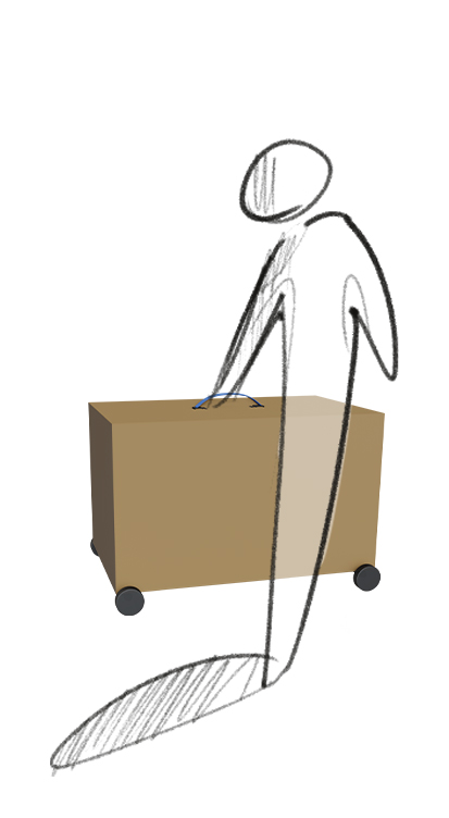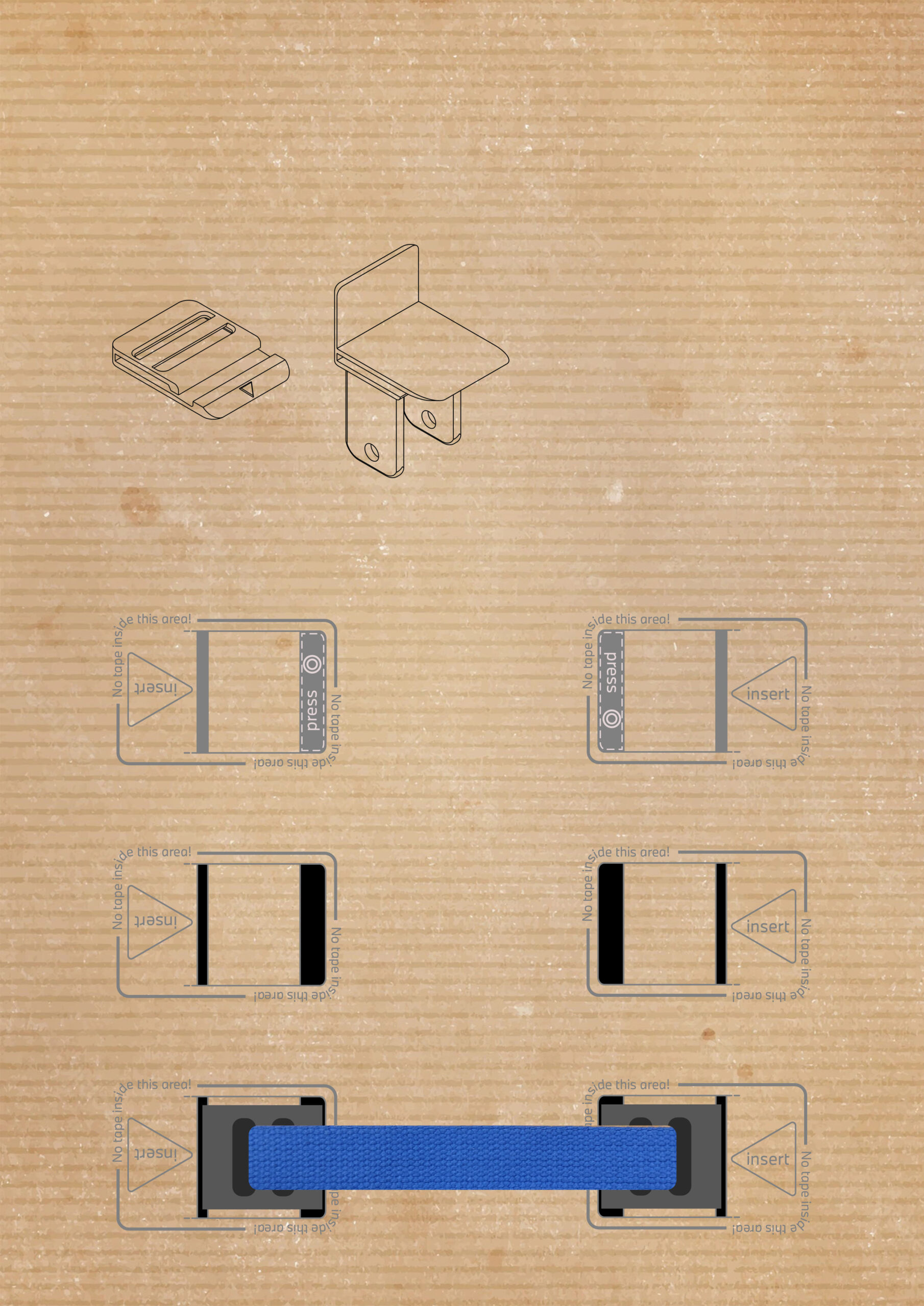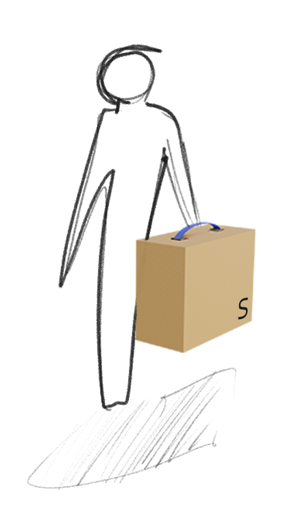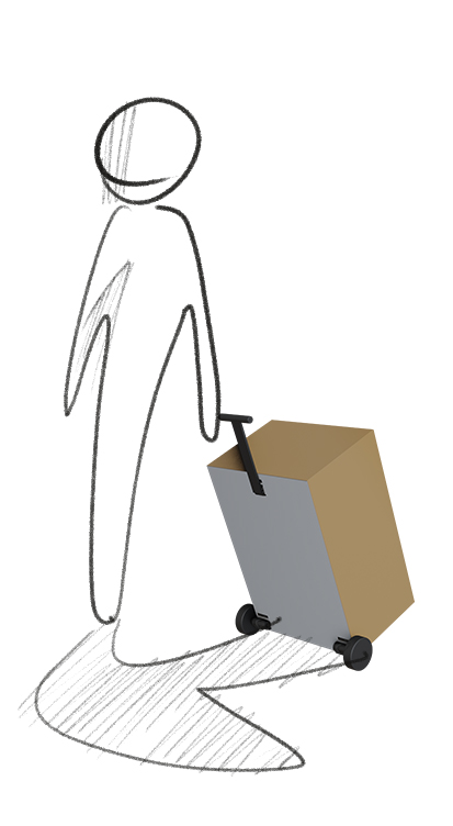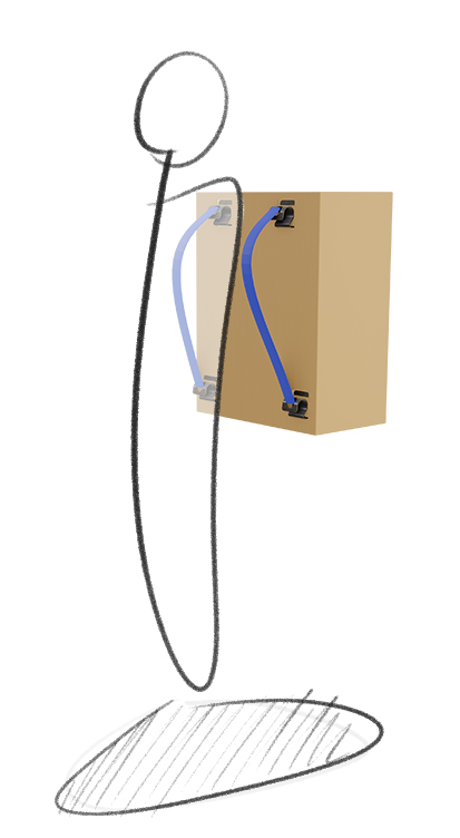 Diese Umverpackung entspricht den bisherigen Pappkartons – mit einer Neuerung: Sie ist mit schlitzförmigen Lochstanzungen versehen, die eingedrückt werden können. Hier lassen sich Transporthilfen – genauer Riemen oder Rollen – einklicken. Die Pappkartons gibt es in drei Größen. Für ihren Transport sind vier Möglichkeiten vorgesehen: Wird der kurze Riemen befestigt, kann ein Paket mit einer Hand getragen werden. Mit zwei Riemen trägt es sich wie ein Rucksack. Werden Rollen genutzt, kann das Paket je nach Rollenanzahl wie ein Koffer gezogen oder nebenher geschoben werden.