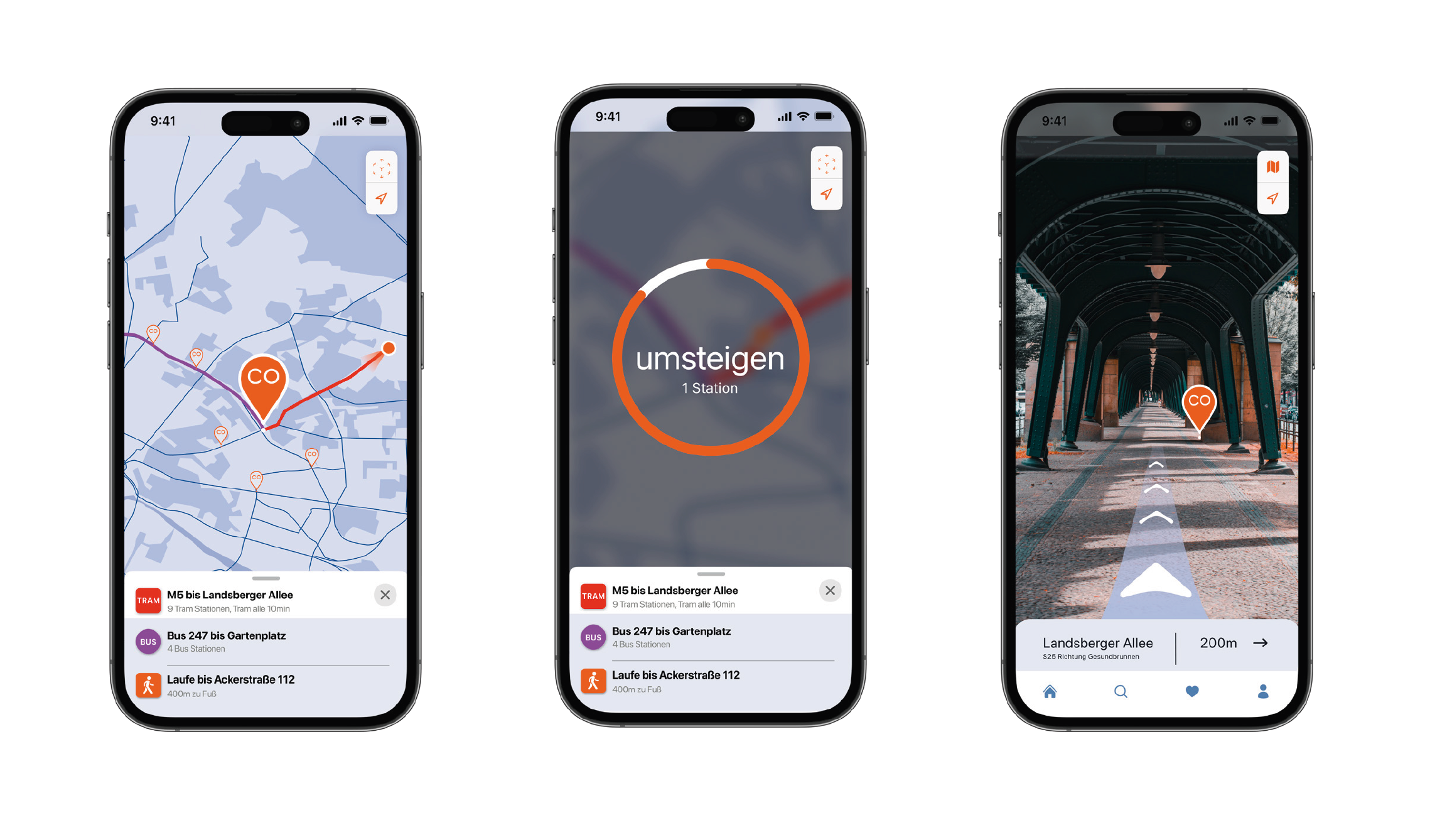 Der zentrale Service besteht aus einer App und einer Infrastruktur mit Service-Punkten. Die Compagno-App ermöglicht Kindern mit eigenem Smartphone eine kindgerechte Navigation: Aufgeräumte Karten mit markanten Anhaltspunkten geben Orientierung. Wechselt das Kind in den AR-Modus, zeigt sich seine Strecke im realen Raum. Darüber hinaus erhält es Hinweise zu Baustellen, Straßenüberquerungen, Hindernissen. Optional definieren Eltern und Kind gemeinsam Tracking-Einstellungen, die sich nur in beidseitigem Einverständnis verändern lassen. An Haltestellen, Bahnhöfen und Cafés findet das Kind Service-Punkte – die sogenannten Compagnos. Über ein Display kann es begonnene Routen weiterführen und ausdrucken oder auch Hilfe rufen. Mitarbeitende von Verkehrsbetrieben werden künftig für die spezielle Unterstützung von Kindern ausgebildet. Eine Kampagne sensibilisiert die Gesellschaft für mehr Aufmerksamkeit. Um dem Sicherheitsbedürfnis der Eltern Rechnung zu tragen, finden Trainings-Workshops für den Umgang mit Compagno statt.