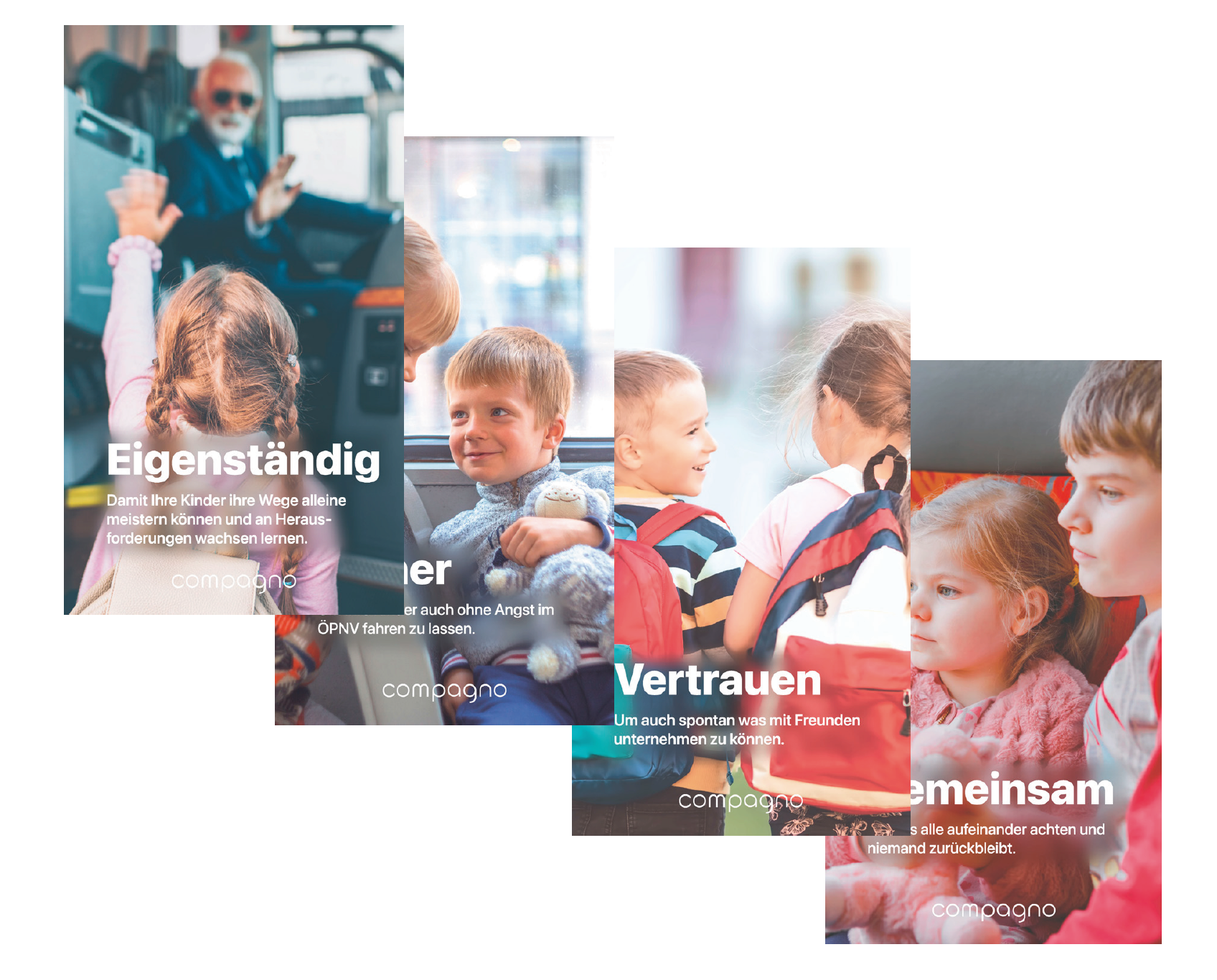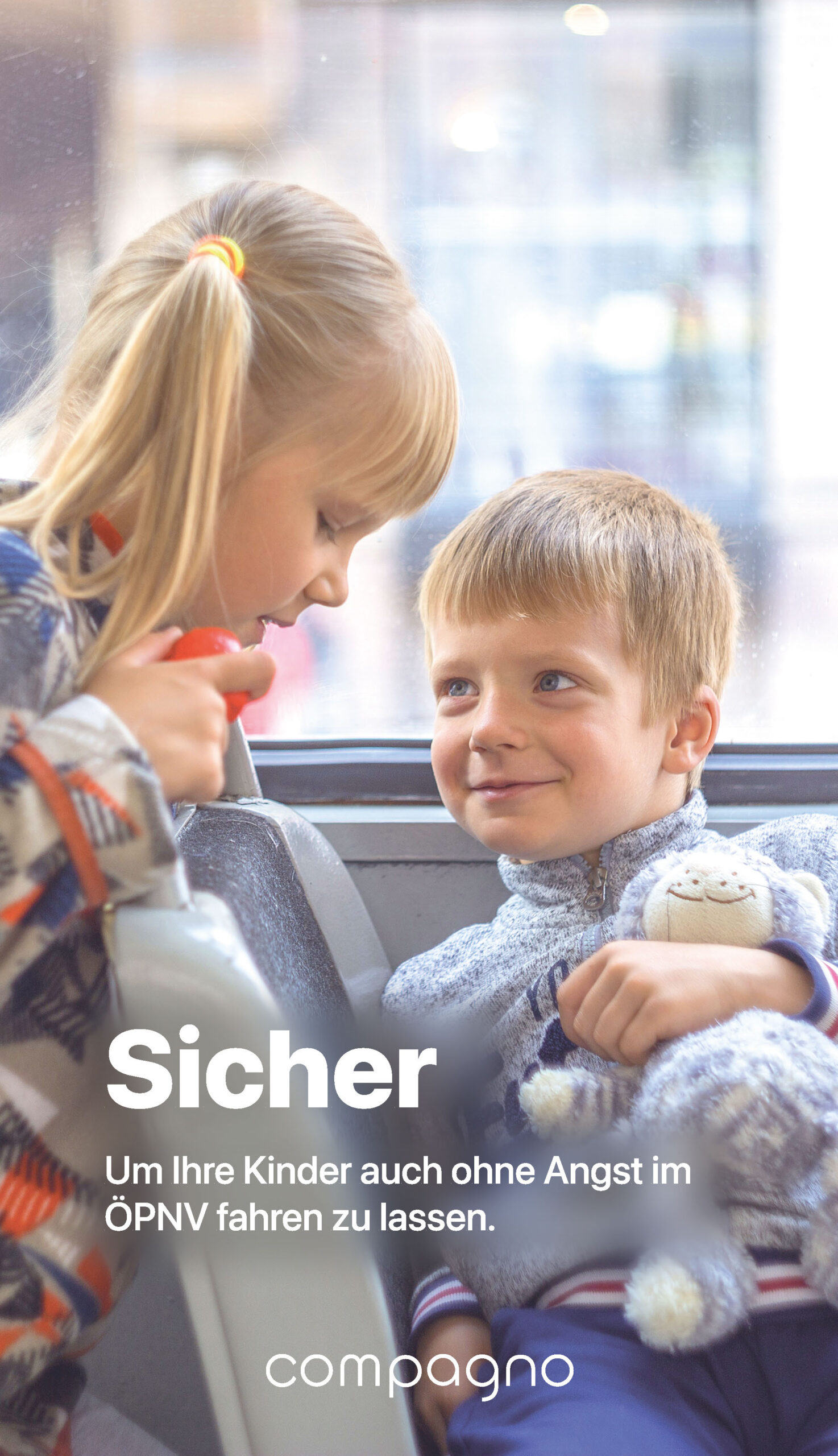 Kinder im Alter von 6 bis 10 Jahren nutzen öffentliche Verkehrsmittel in der Stadt selten allein. Trotz gut ausgebautem ÖPNV-Netz bevorzugen Eltern für alltägliche „Kinder-Wege” zur Schule, zu Freunden, Verwandten oder Freizeitaktivitäten oft das Auto. Kinder könnten diese Wege jedoch eigenständig bewältigen. Die Initiative Compagno unterstützt Kinder dabei sich selbstständig und gesichert auf den Weg zu machen. Die Compagno-App ermöglicht Kindern mit eigenem Smartphone eine kindgerechte Navigation. Kinder lernen damit früh sich selbstbewusst in einer mobilen, wie auch digitalen Gesellschaft zu bewegen.