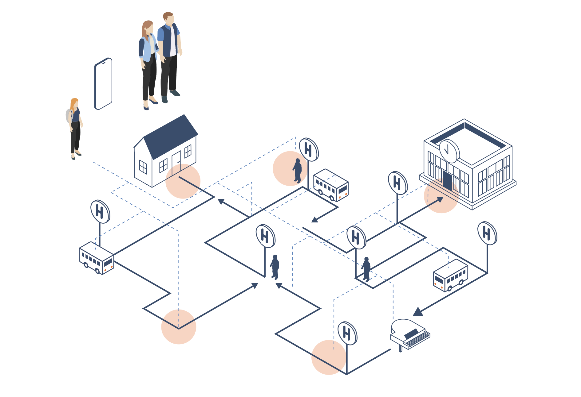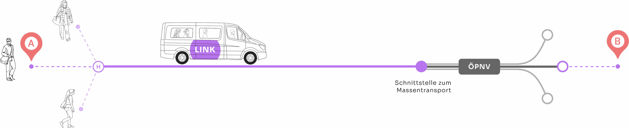 LINK ist ein vom ÖPNV getragener Service. Er dient der Planung von tangentialen Pendlerstrecken in der Peripherie. Ausgehend von Pilotstrecken mit Kleinfahrzeugen tragen Pendler*innen ihren individuellen Streckenbedarf ein.