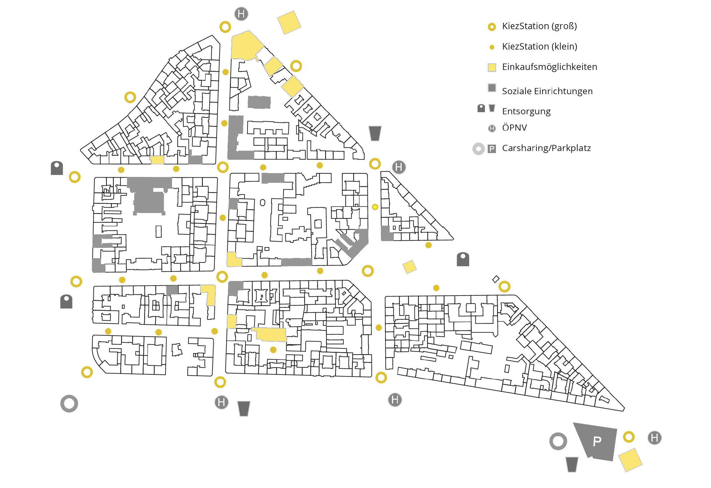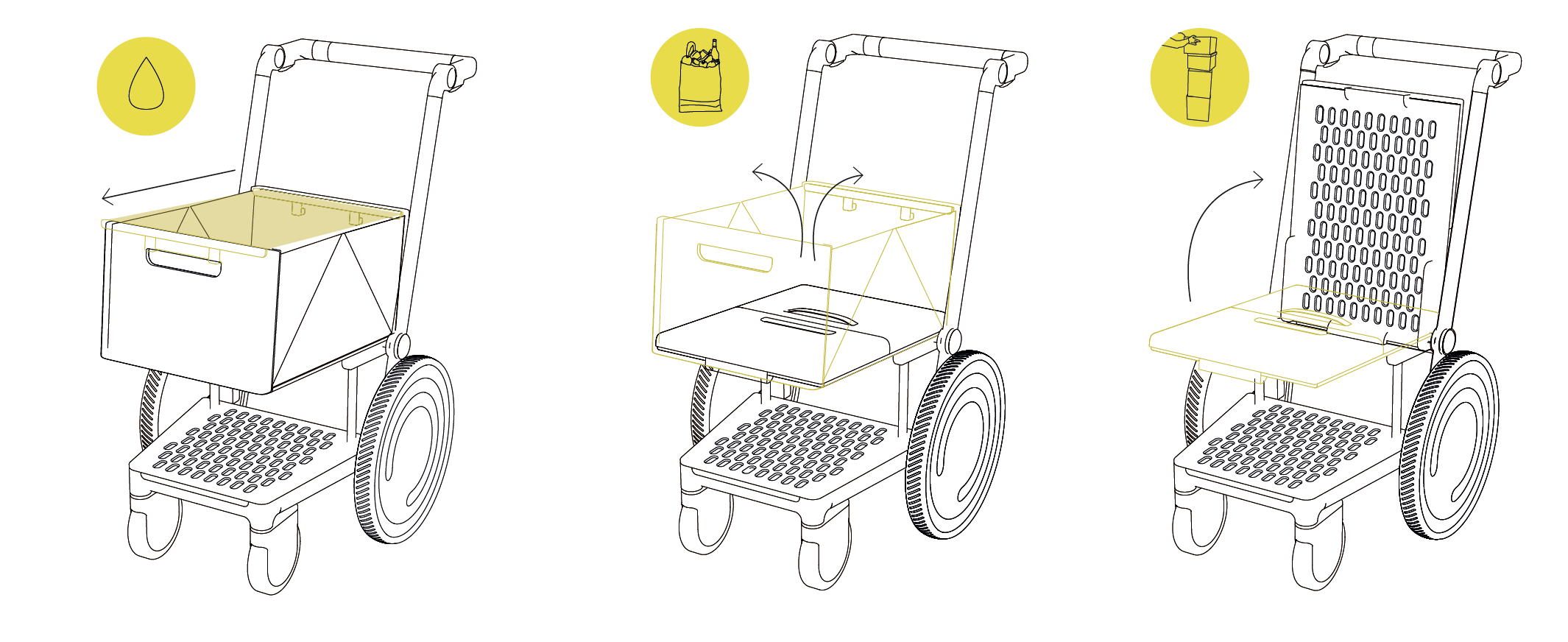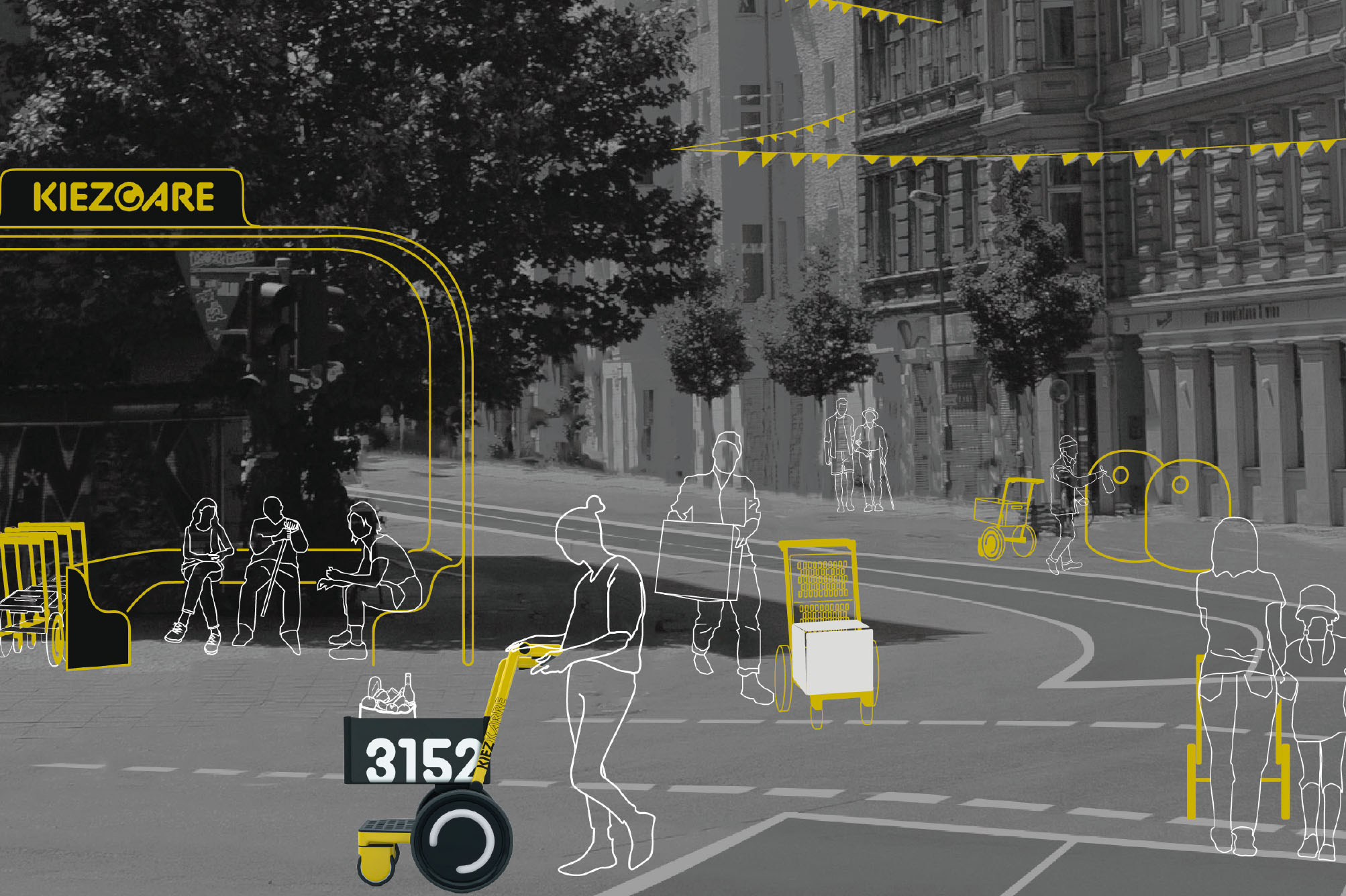 Das Gefährt hat zwei Transportflächen mit unterschiedlicher Höhe. Darauf können beispielsweise Getränkekisten oder Pflanzen stehen. Als zweite Variante lässt sich die obere Fläche in ein Volumen verwandeln: Dafür klappt man die auf der Fläche liegende Vorder- und Rückwand hoch. Die jeweiligen Langseiten spannen sich mit Planen auf. In der so entstandenen Box finden lose Objekte sicheren Stand. Für besonders lange oder sperrige Dinge lässt sich die KiezKarre drittens zur Sackkarre umfunktionieren. Dafür wird die gesamte obere Fläche hochgeklappt. Fest montierte Spanngurte sichern den Transport. Ausgeliehen werden kann das Gefährt kostenfrei an zahlreichen Stationen im Kiez. Ähnlich wie bei gewöhnlichen Einkaufswagen wird es mit einer Euromünze entsperrt. Die Infrastruktur von KiezCare wird von der Stadt getragen und durch Einnahmen aus Werbung auf den Stationen und Vehikeln finanziert. KiezCare kompensiert das fehlende Auto und bewahrt bequemes Transportieren im Alltag. So trägt das Konzept zum Wohlbefinden bei und erhöht die Lebensqualität der Bewohner*innen gegenwärtiger und zukünftiger autofreier Stadtquartiere.