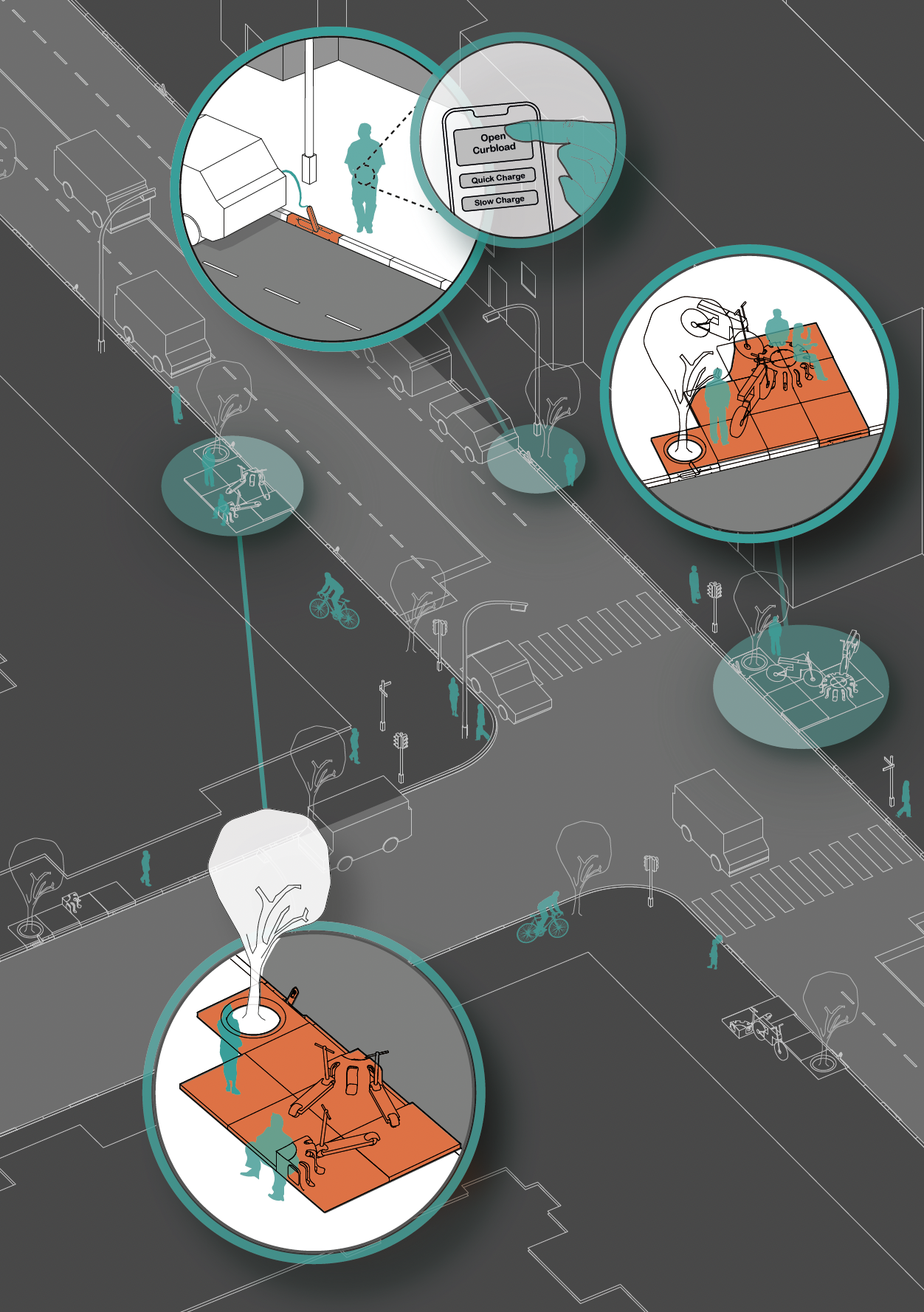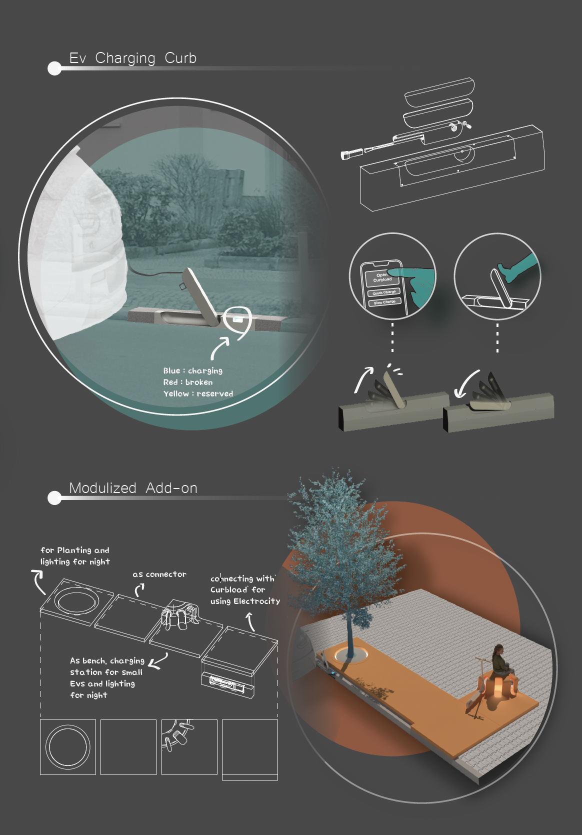 Die unzureichend ausgebaute Ladeinfrastruktur und deren Ladenetzte im öffentlichen Raum sind eine zentrale Herausforderung für den klimapolitisch gewollten, schnellen Umstieg auf Elektrofahrzeuge. Neben der funktionalen Integration in den Stadtraum, wird die benötigte Masse an Ladepunkten auch ästhetisch zum Problem. Curbload entwickelt einen modularen Ansatz für in die Bordsteinkante integrierte Ladepunkte.