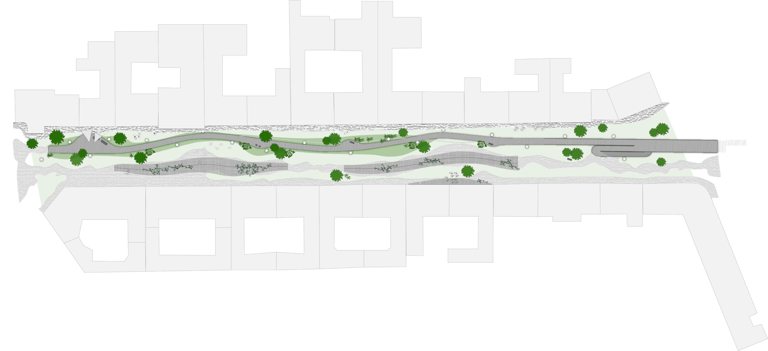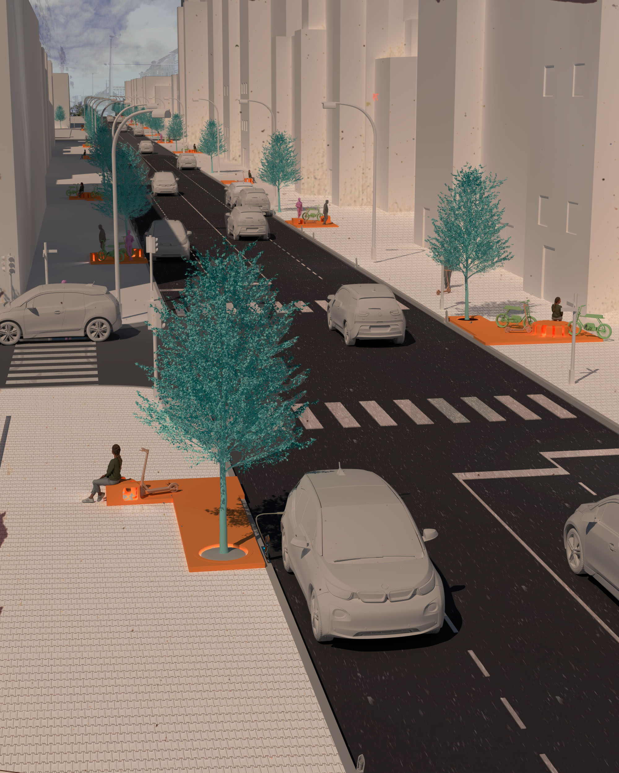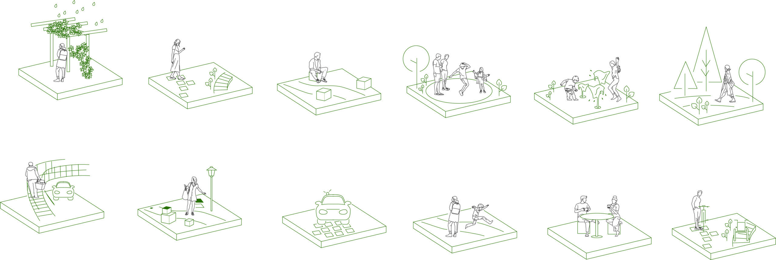 Großzügige Begrünungen und Überdachungen sorgen für kühlenden Schatten und klarere Luft. Wasserspiele tragen zum erholsamen Klima bei. Zugunsten verlässlicher Sicherheit werden die Strecken entsprechend den Tageszeiten beleuchtet. Bänke machen die Nutzung von Gehwegen kommunikativ. All diese Eingriffe fungieren zugleich als Landmarks – sie tragen zur Orientierung bei.