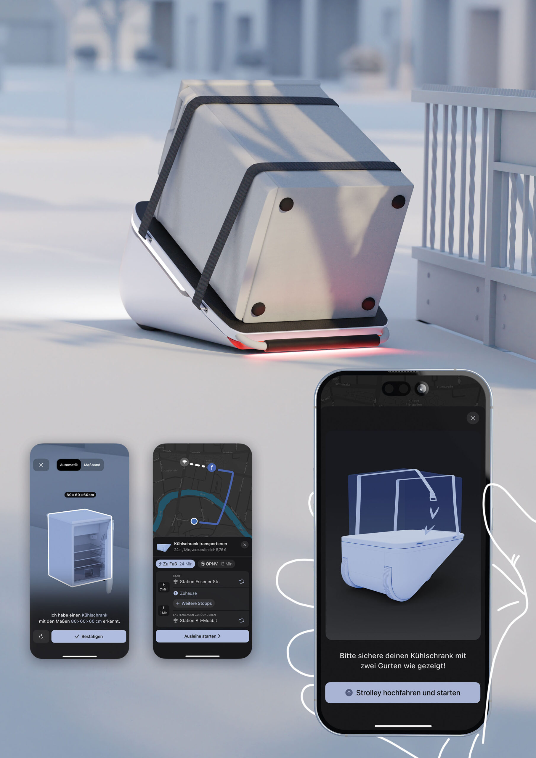 Zu Beginn der Nutzung wird die Ladung via Smartphone-Kamera gescannt. Eine KI erkennt die Merkmale und interpretiert das Objekt. Die Service-App weiß, wie viele Strolleys für die Größe des Objektes benötigt werden. Sie gibt Hinweise zum mühelosen Beladen und zum sicheren Angurten der Fracht. Durch Eingabe des Zielortes zeigt die App barrierearme Routen an. Optional wird der ÖPNV in die Streckenempfehlung integriert. Mit seiner Größe von 100 x 70 cm passt Strolley in Fahrstühle, Busse und Bahnen.