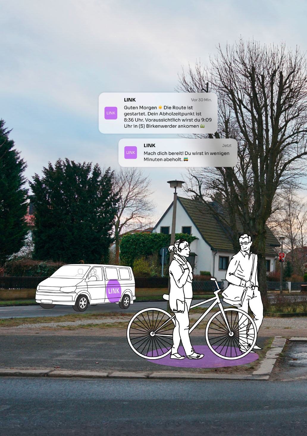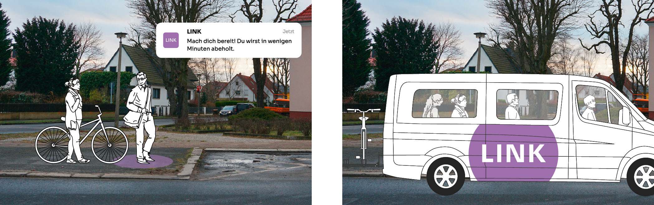 Menschen, die zwischen Wohnort und Arbeitsstelle in der Peripherie pendeln, haben oft unnötig lange Fahrwege: Da sich der öffentliche Nahverkehr meist sternförmig auf das Stadtzentrum hin ausrichtet, müssen Pendler*innen erst tief in die Stadt hinein, um andernorts in die Peripherie hinauszugelangen. So wird von ihnen anstelle des ÖPNV vorwiegend das eigene Auto genutzt. LINK ist ein Service, der den Bedarf an Pendlerstrecken in der Peripherie registriert. Er erlaubt die direkte Einflussnahme auf die Routengestaltung durch die Pendler*innen selbst und reduziert den Individualverkehr.