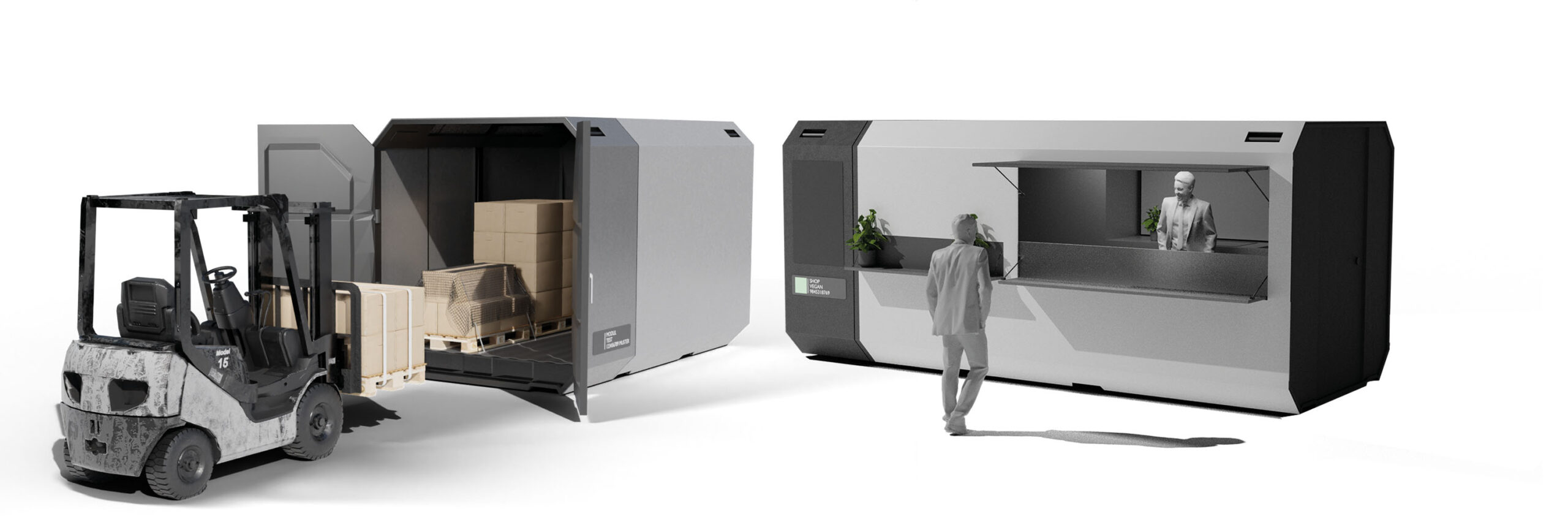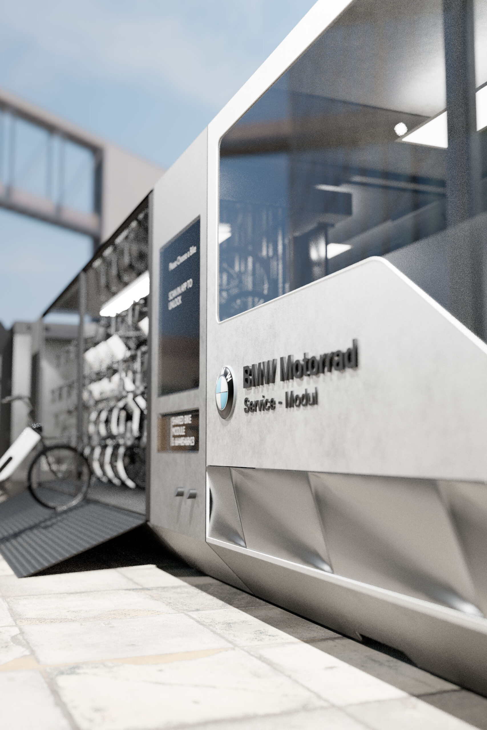 Die Containereinheiten gibt es in drei Größen, die von den DIN-Maßen eines Schiffscontainers abgeleitet sind. Die kleine Einheit eignet sich optimal für die Zustellung von Paketen in Form mobiler Packstationen. Die mittlere Größe ist vor allem für den Warentransport und die Verteilung von Gütern im urbanen Raum vorgesehen. Die letzte Einheit bietet die größte Grundfläche und ermöglicht somit den individuellen Innenausbau für begehbare Shops sowie soziale oder medizinische Angebote. Die Containereinheiten werden während der üblichen Taktzeiten am Bahnsteig mithilfe eines Hubwagens entladen. Von dort aus können sie zu ungenutzten Abschnitten der Bahnsteige rangiert werden. Schließlich kann ein Portalkran die Containereinheiten von den Stationen zur Weiterverteilung auf unmittelbar anliegende Straßen befördern. Angrenzende Freiflächen werden damit zu zentral gelegenen »Märkten« und können flexibel über das Schienennetz verteilt und versorgt werden. Die Effizienz der S-Bahn-Infrastruktur wird durch die Nutzung für den Transport von Waren und temporären Services ressourcenschonend gesteigert. Der Straßenverkehr wird entlastet und eine Vielfalt an mobilen Angeboten geschaffen.