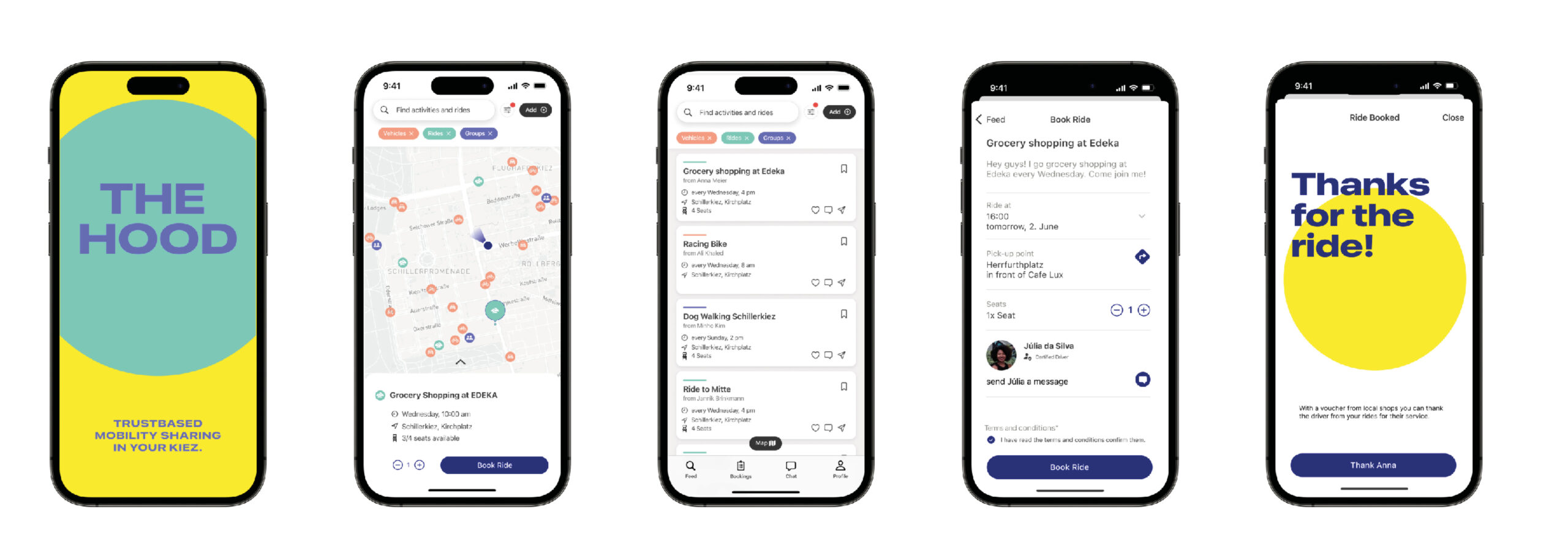 The Hood basiert auf einer App: Privatpersonen registrieren ihre Fahrzeuge, vom Kinder- oder Lastenfahrrad bis hin zum Van. Für die Nutzung im Ausleihmodus ist ein einfaches Vergütungsmodell vorgesehen, das sich auf Versicherungsschutz und Benzin- bzw. Stromkosten beschränkt. Angeboten werden nicht nur Fahrzeuge, sondern auch Fahrgemeinschaften, wie zur täglichen Fahrt ins Büro oder zum Ausflug an den See. Diese Mitfahrten sind kostenfrei. Um den Einzelhandel im Kiez zu unterstützen, kooperieren Shops, Restaurants und Cafés mit The Hood. Nutzer*innen können Gutscheine kaufen, um sich für eine Mitfahrt zu bedanken.