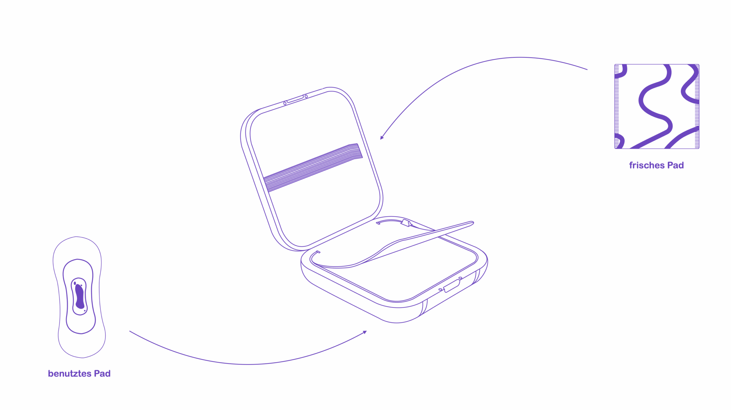 Die Verpackung und das Silikon-Case ergänzen die Polly App. Da Harninkontinenz ein sehr intimes Thema ist sind die Polly Produkte diskret gestaltet und ermöglichen es betroffenen Frauen ihre Erkrankung für sich zu behalten. Die Verpackung verrät von außen nicht um welches Produkt es sich handelt und ähnelt eher einem Perioden Artikel, wodurch sie im Badezimmer nicht weiter auffällt. Durch eine leichte Schräge am Boden der Verpackung wird das einfache Entnehmen der einzelnen Pads ermöglicht.