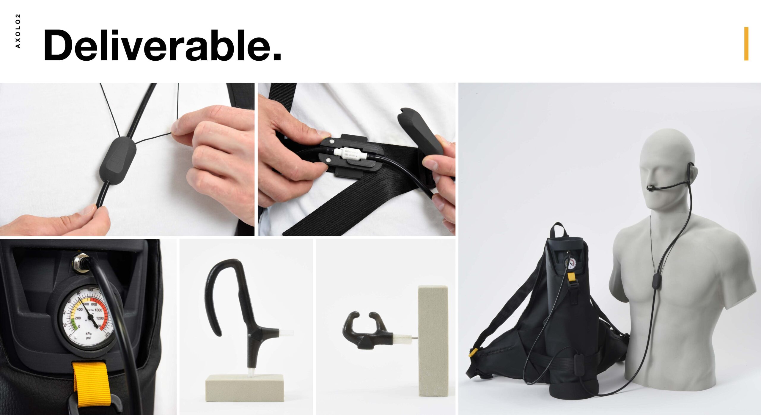 axolo2 ist ein System zur Unterstützung der Atmung für die nächste Generation von Menschen, die mit COPD (Chronisch obstruktive Lungenerkrankung) im Stadium 2 leben und deshalb zusätzlichen Sauerstoff benötigen. Das Ziel ist es, diesen Übergang zu externem Sauerstoff so reibungslos wie möglich zu gestalten und zu entstigmatisieren.