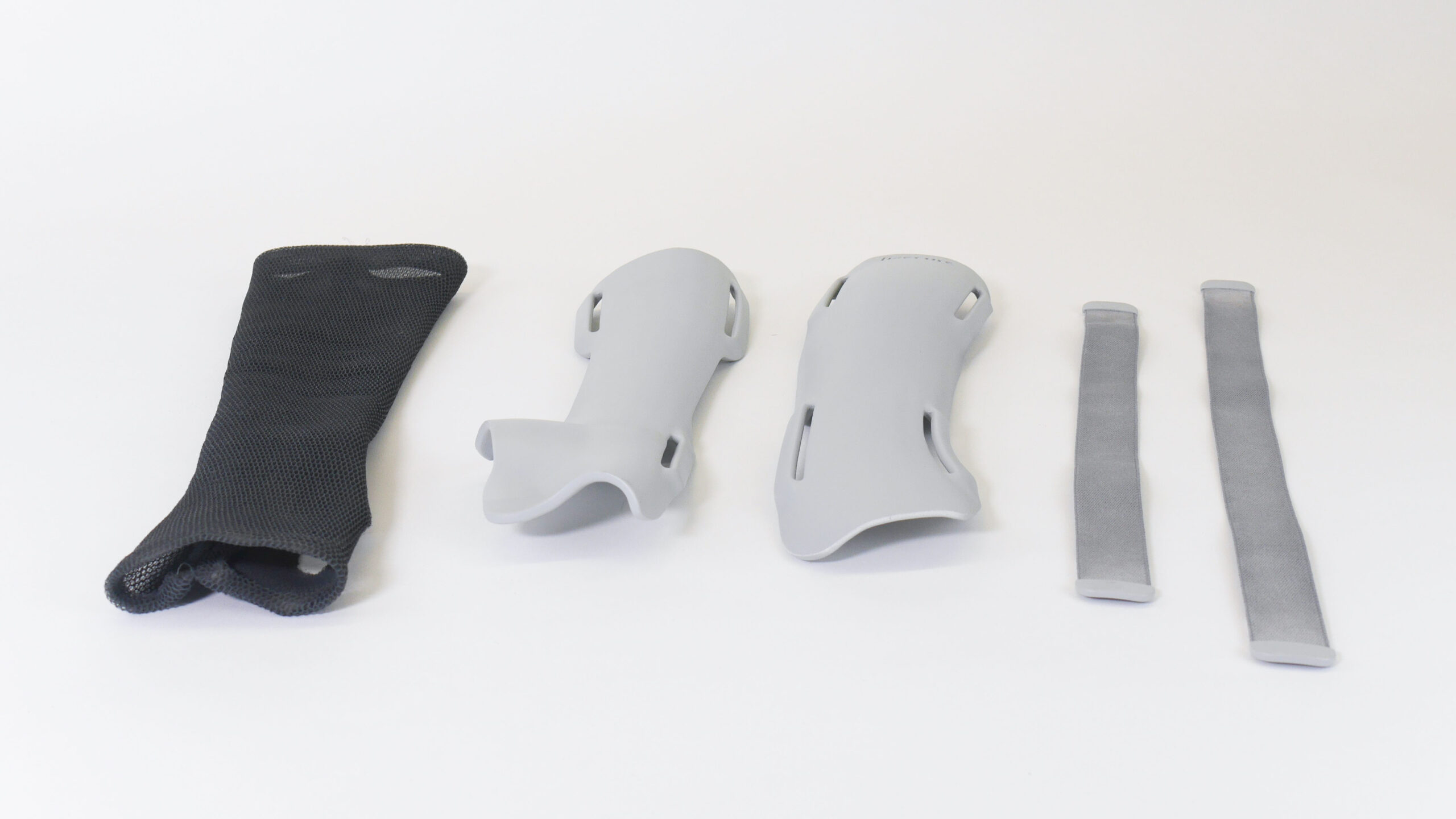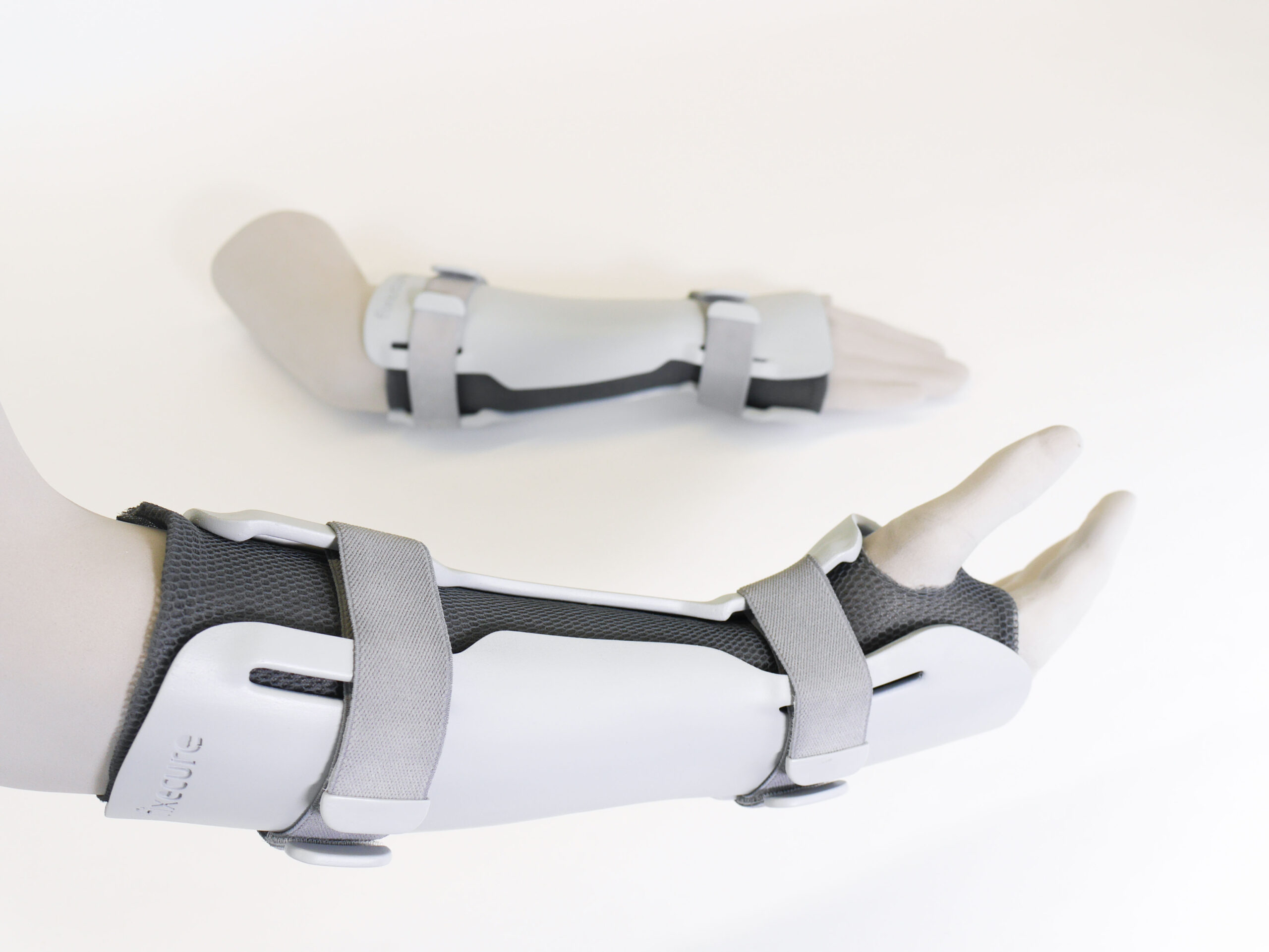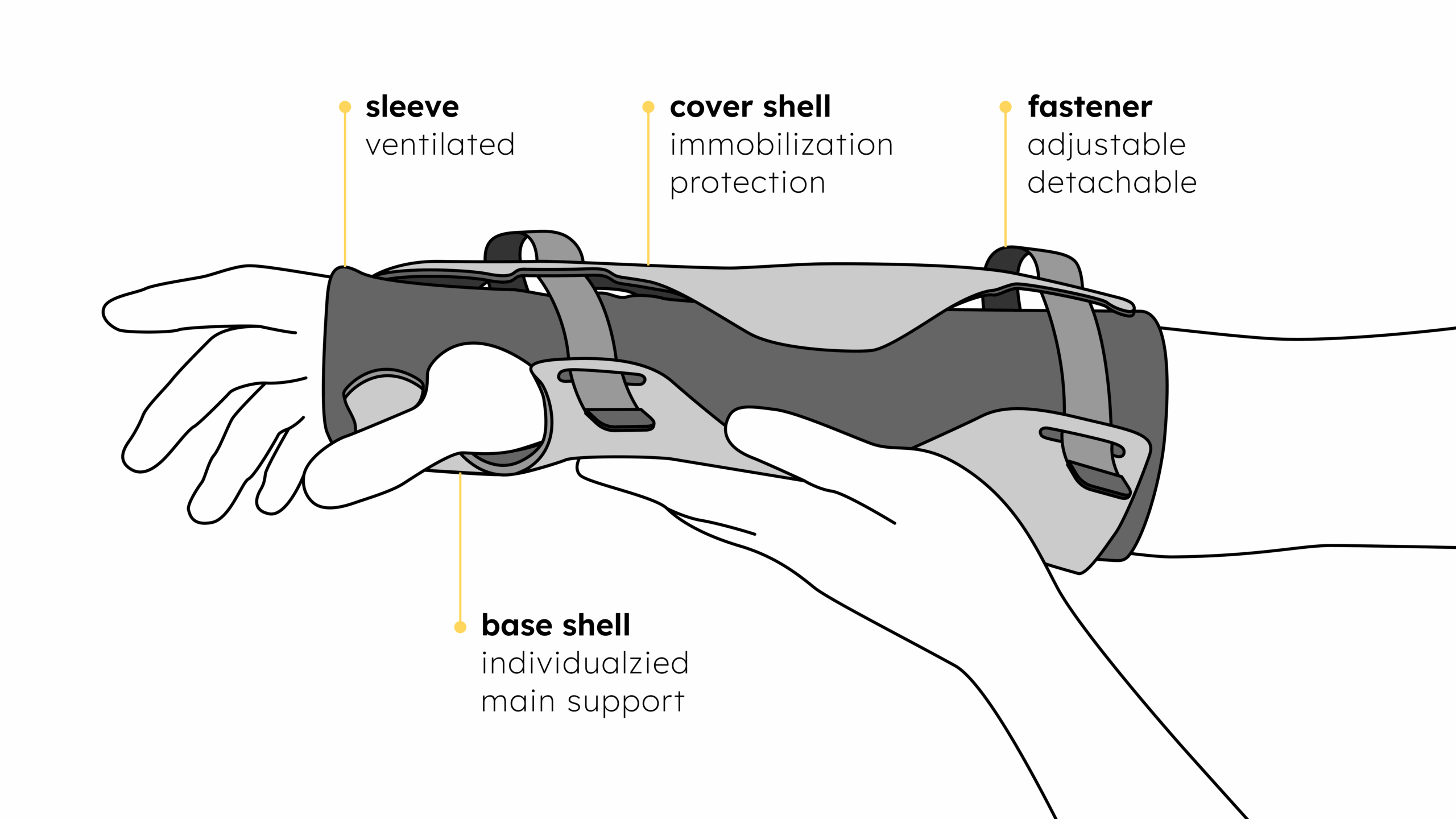 Die elastische Manschette ersetzt eine herkömmliche Bandage, lässt sich leicht anlegen und ist gut belüftet. Die individuell angepasste Basisschale stabilisiert Handgelenk und Unterarm und unterstützt die Knochenheilung. Die Deckschale sorgt für zusätzliche Ruhigstellung und maximalen Schutz. Beide Schalen werden mit einem dezenten Klettverschluss sicher fixiert und lassen sich präzise einstellen. Sobald weniger Stabilität nötig ist, kann die Deckschale abgenommen werden – die Basisschale reicht dann zur Unterstützung aus. Ziel ist ein flexibles Produkt, das den Heilungsverlauf optimal begleitet.