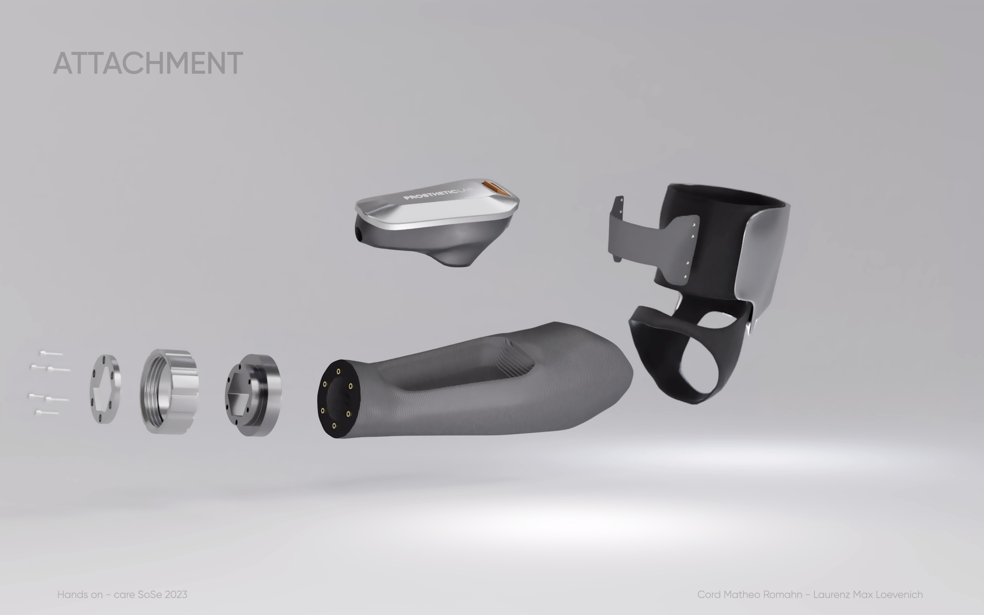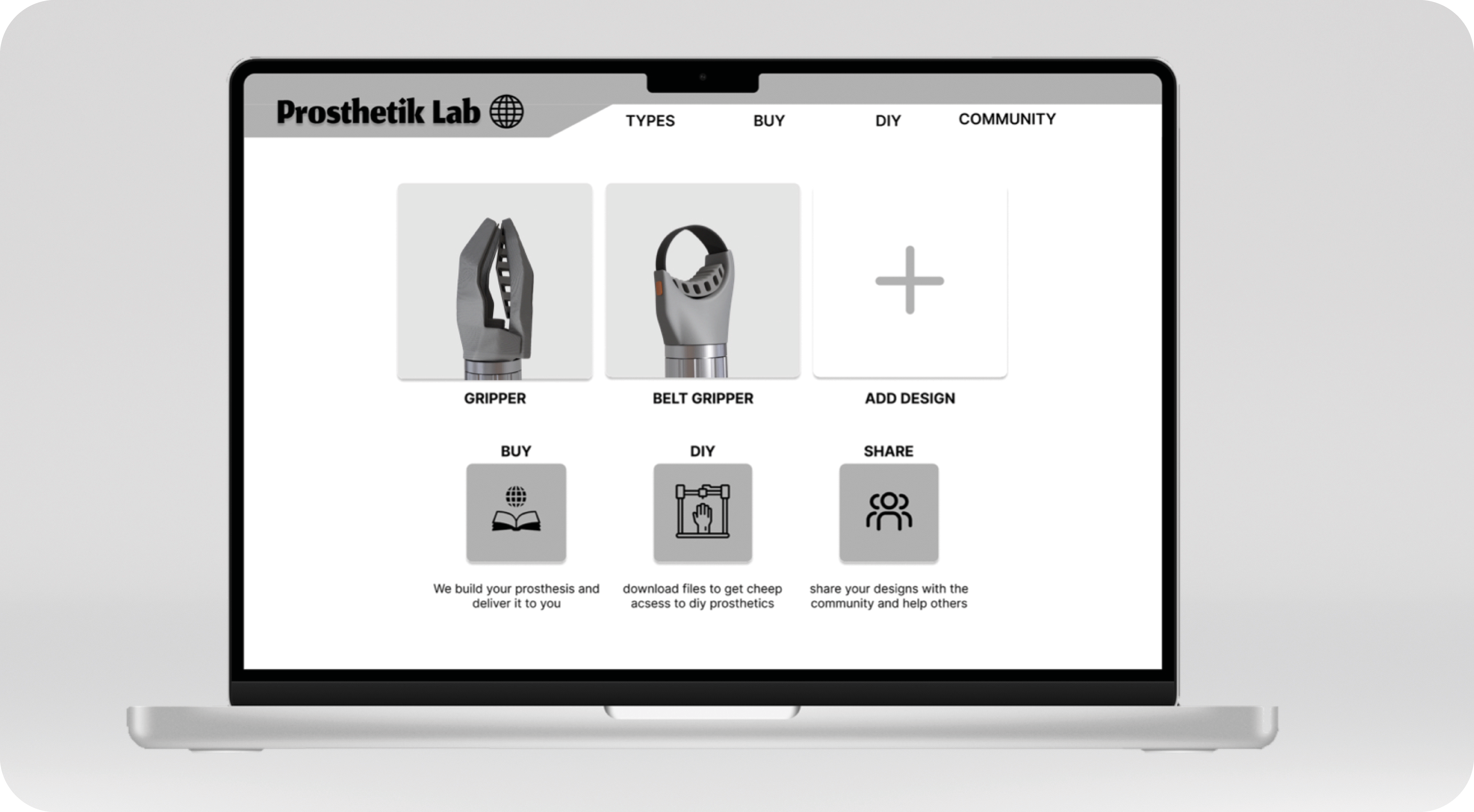 Die digitale Schnittstelle des Konzepts fungiert als eine Plattform, die den Austausch zwischen den Patienten und Nutzern in Bezug auf die Funktionalität der Prothese ermöglicht. Darüber hinaus nutzen wir das enorme Potenzial der Open-Source-Schnittstelle. Nutzer haben die Möglichkeit, 3D-Modelle für verschiedene Prothesenaufsätze herunterzuladen und diese selbst zu drucken. Zusätzlich können sie selbstmodellierte Aufsätze hochladen und somit mit der Community teilen, um die Kollektivkreativität und den Erfahrungsaustausch zu fördern. Dieser Ansatz stärkt die Partizipation der Nutzer und trägt dazu bei, individuelle Anpassungen und Innovationen in der Prothesenentwicklung voranzutreiben.