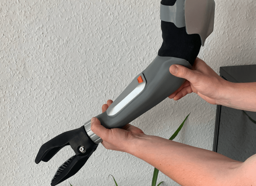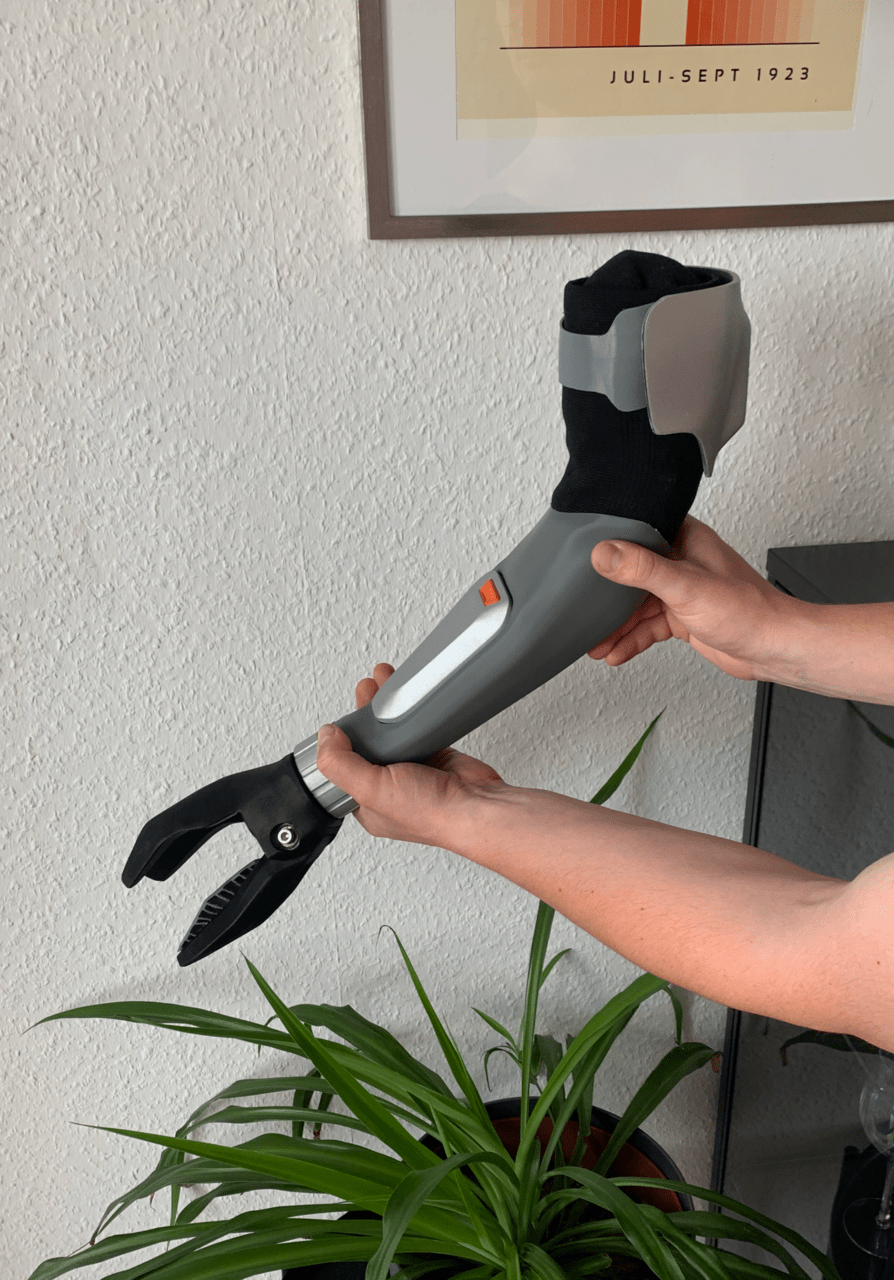 Vorne sitzt ein Konnektor zur einfachen Befestigung wechselbarer Aufsätze. Der 3D-gedruckte Hauptkörper enthält die Motoreinheit, die Bewegungen steuert. Für sicheren Halt am Stumpf sorgen eine Bandage und eine formstabile Hartschale.