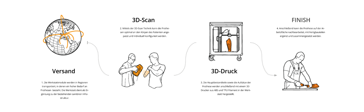 Das mobile „Prosthetic Lab“ ermöglicht in Krisengebieten einen kostengünstigen und lokalen Zugang zu Prothesen durch eine mobile Werkstatt, die parametrische Armprothesen mittels 3D-Scan und 3D-Druck herstellt. Die traditionelle Herstellung von Prothesen ist ein aufwändiger und teuer Prozess. Im Kontrast dazu steht, dass sich 80% der Amputationsopfer in Krisengebieten befinden, denen oft die finanziellen Mittel und der lokale Zugang zu Prothesen fehlt. Mit der mobilen „Prosthetic Lab“ Werkstatt soll diesen Menschen geholfen werden, indem ein lokaler und günstiger Zugang zu Prothesen geschaffen wird und durch ein Open-Source-System die kontinuierliche Weiterentwicklung gefördert wird.