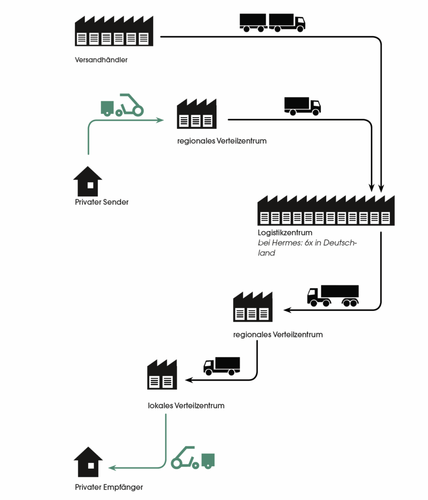 Heutige Liefersysteme sind sehr gut organisiert, denn sie funktionieren trotz ihrer logistischen Komplexität. Deshalb sehe ich es als sinnvoll an, das Netzwerk in die Infrastruktur gegenwärtiger Liefersysteme einzugliedern, bzw. an entsprechender Stelle nämlich dann, wenn die sperrigen Lieferwägen zum Einsatz kommen – als Alternative anzubieten. Auf der Abbildung ist eine vereinfachte Grafik über das Paketverteilsystem von Hermes zu sehen. Das vorgesehene Dienstleistungssystem, namens „Modula“, soll dafür sorgen, dass Pakete von privaten Kunden zu den regionalen Verteilzentren etablierter KEP-Dienstleister mittels Individualverkehrseinheiten transportiert werden und umgekehrt von den regionalen Verteilzentren zu den privaten Empfängern gelangen.