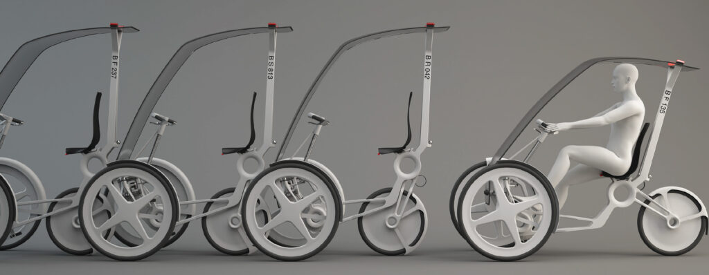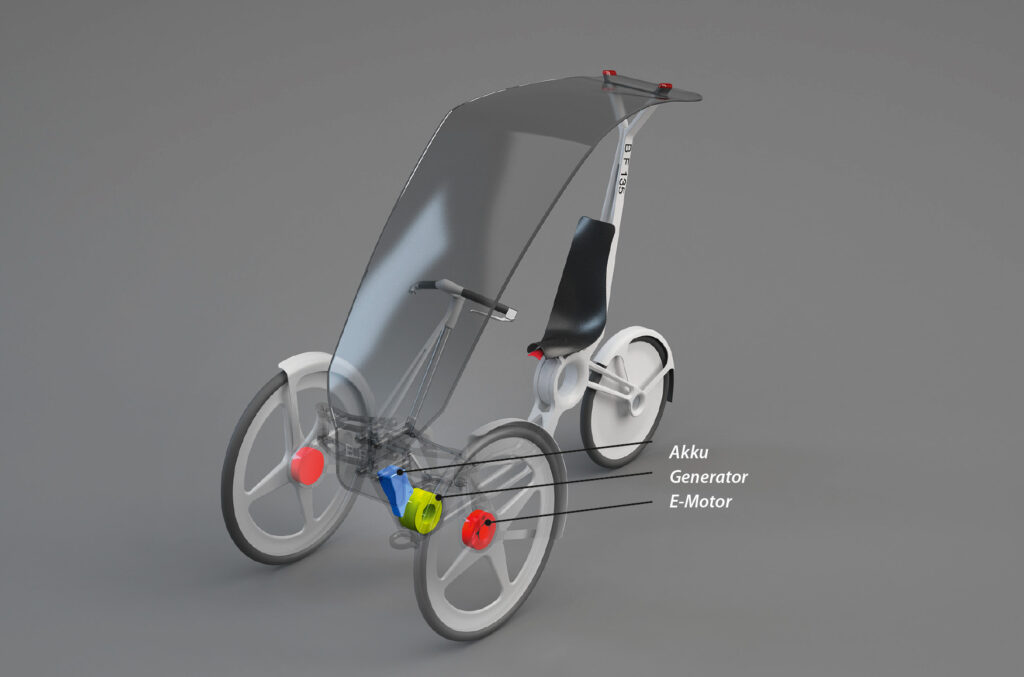 Das Individualverkehrsmittel gehört zum Angebot eines intermodalen ÖPNV im urbanen Raum. Das favorisierte Betreibermodell schafft Anreize, die individuelle Mobilität mit der Güterfeinverteilung zu verbinden. Deshalb ermöglicht das Fahrzeug die Anbindung von Transporteinheiten für Güter und ist -als Alternative zum Automobil – auf die Erwartungen einer breiten Nutzerschicht ausgerichtet. Als dreirädriges Fahrzeug mit Neigungsfähigkeit hat es ein sicheres Fahrverhalten. Der Hybridantrieb aus E-Motor und Muskelkraft und der Wetterschutz sorgen für angemessenen Komfort. Die relativ geringen Abmessungen und die gewichtsoptimierte Bauweise reduzieren Energie- und Raumbedarf.