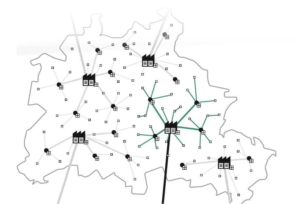 Die Abbildung zeigt exemplarisch das Verteilungsnetz der Pakete an einem von mehreren lokalen Verteilungszentren der Stadt. Die schwarze Linie steht für den geläufigen Transport der Boxen durch Lastwägen, die grünen Linien für den Transport mithilfe von „Modula“. Je dicker die Linien, desto mehr Boxen werden im Laufe des Tages auf der Route befördert.