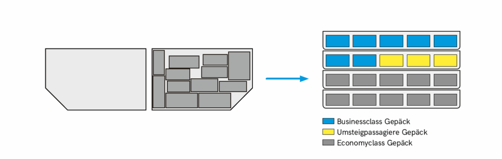 Von einer Digitalisierung der Infomationen des Gepäckcontainers profitieren die Beteil-igten auf dem Vorfeld: Zeit- und Arbeitseffektivität. Mit dem Regalprinzip ist es möglich, die Koffer nach Ziel, Sitzklasse und Umsteiggepäck zu systematisieren. Somit könnte Zeitverschwendung während der Re-Sortierung und des Transports vermieden werden. Durch die separierte Sektion bekommen die Lademeister sowohl im Vorfeld als auch in der Ladehalle eine Übersicht, wie die Gepäckstücke aufgeteilt und beladen werden. Die Koffer können sofort identifiziert und im Zwischenflughafen sofort aussortiert werden, ohne weitere Scans zu machen oder sie auf die Förderbandanlage zu bringen. Durch die organisierte Beladung nach Priorität der Sitzklasse, wissen die Gepäckabfertiger auch genau, welcher Koffer zuerst ausgegeben werden soll.