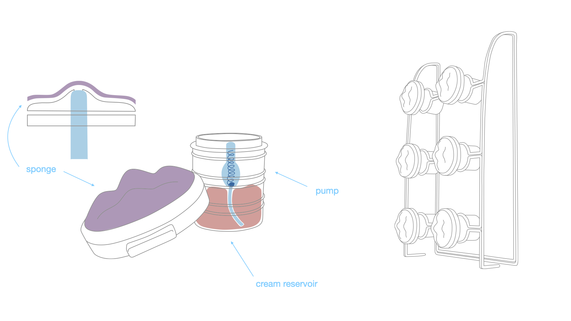 Den Fokus liegt hier auf besonders schwer erreichbaren Körperstellen: der Rücken und die Füße. Die Eincremehilfe für den Rücken kann beliebig an der Wand oder auf einem Stuhl befestigt werden. Die Eincremehilfe für die Füße kann bequem im gesamten Wohnbereich genutzt werden. Mit Creme gefüllte Reservoirs bieten ausreichend Platz über den täglichen Bedarf hinaus und müssen je nach Bedarf nur selten neu aufgefüllt werden. Durch Druck tritt die Creme aus einer grobporigen Schaumschicht aus, und kann somit gleichmäßig verteilt werden. Gumminoppen unter dieser Schicht sorgen für den Massage Effekt.