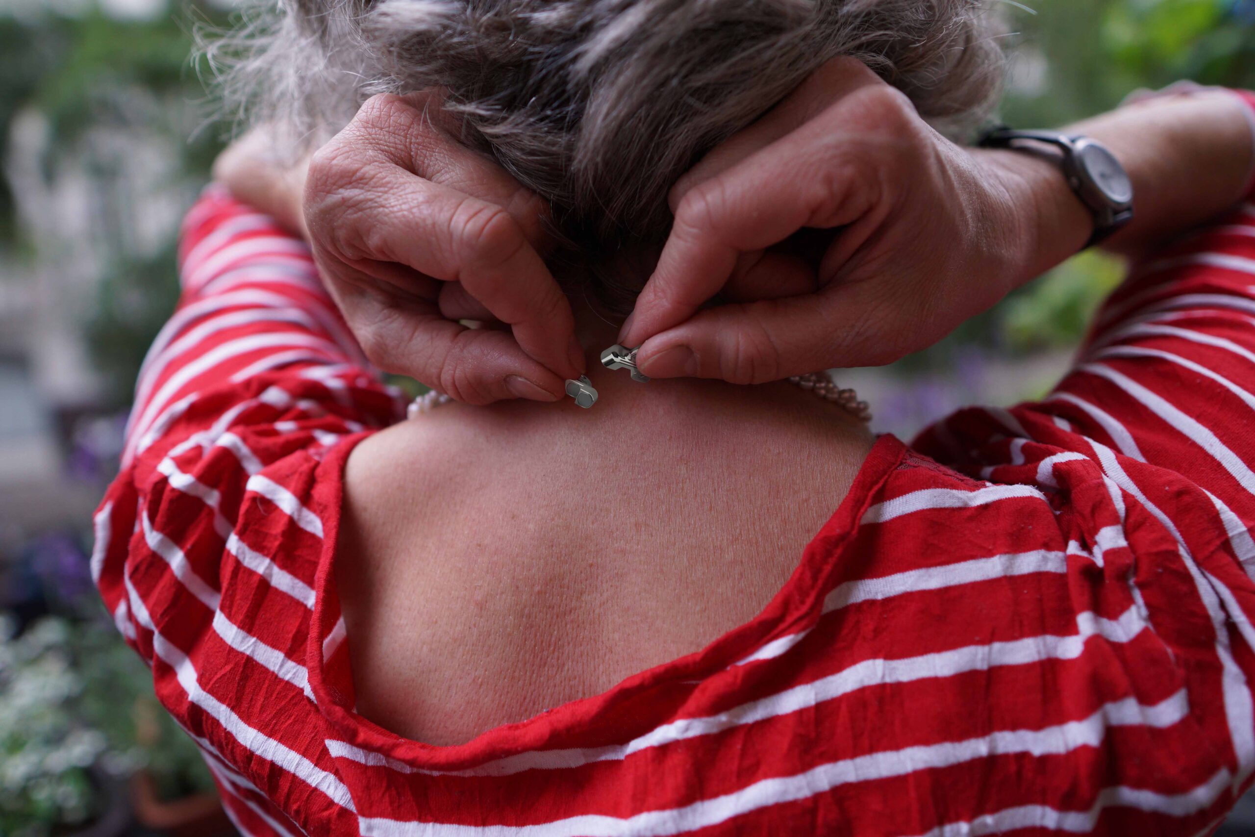 Unser Helping Hand Kettenverschluss-Adapter ermöglicht es Menschen mit eingeschränkten motorischen Fähigkeiten, Schmuck einfach selbst zu öffnen und zu schließen. Das erlaubt einen Prozess des beliebigen An- und Ablegens des Schmuckes, sodass eine Vielfalt an Entscheidungen über das eigene Aussehen getroffen werden können. Der Adapter wird dabei an den vorhandenen Verschluss angesetzt, sodass der Schmuck selbst völlig intakt bleibt.