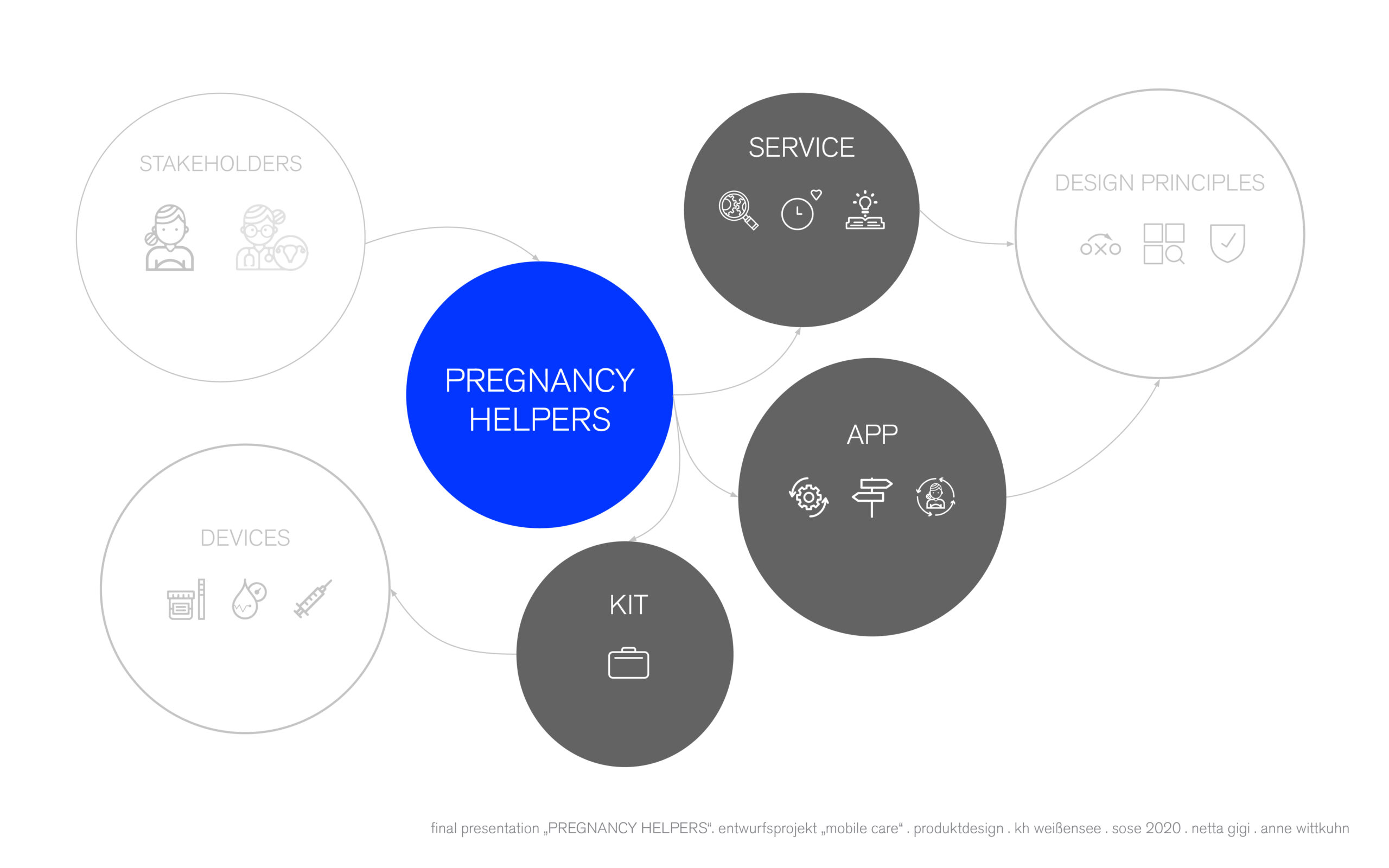 Ein wichtiger Teil unserer Arbeit war es, eine einfache, übersichtliche und benutzerfreundliche Benutzeroberfläche zu gestalten. Sie informiert die Nutzerin über die richtige Anwendung der Geräte, warnt bei kritischen Vitalwerten, zeigt allgemeine Informationen zur Schwangerschaft an und begleitet durch die Nutzung. Der Service richtet sich an Frauen während ihrer neunmonatigen Schwangerschaft in Deutschland, insbesondere an potenzielle Nutzerinnen in ländlichen Regionen.