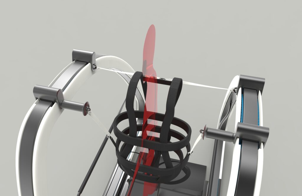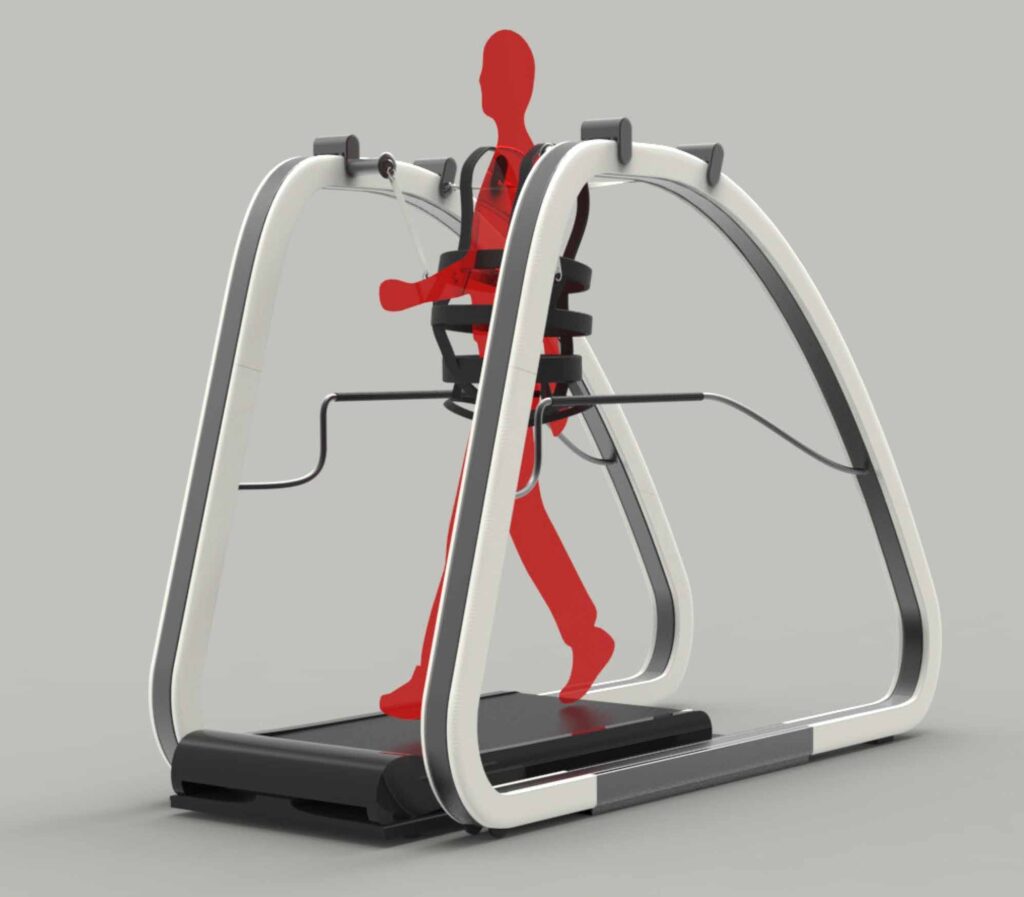 Eine 4-Punkt-Sicherung schützt vor dem Fallen und entlastet das Körpergewicht. So können seitliche und rotatorische Bewegungen simuliert werden, die trotz fehlender Orthesen Bewegungsansätze bieten.