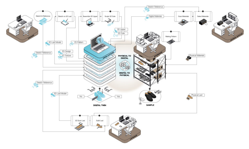 Kern des Workflows ist eine digitale Plattform, die eine nahtlose Verbindung zwischen analogem Handwerk und digitalen Prozessen schafft. Sie ermöglicht die Echtzeit-Visualisierung von Designs, das Scannen von Materialien und die Nutzung von Augmented Reality für Entwurfsbewertungen. Ziel ist es, die handwerkliche Qualität des Schuhmacherberufs zu bewahren und gleichzeitig die Effizienz und kreative Freiheit neuer Technologien zu nutzen.