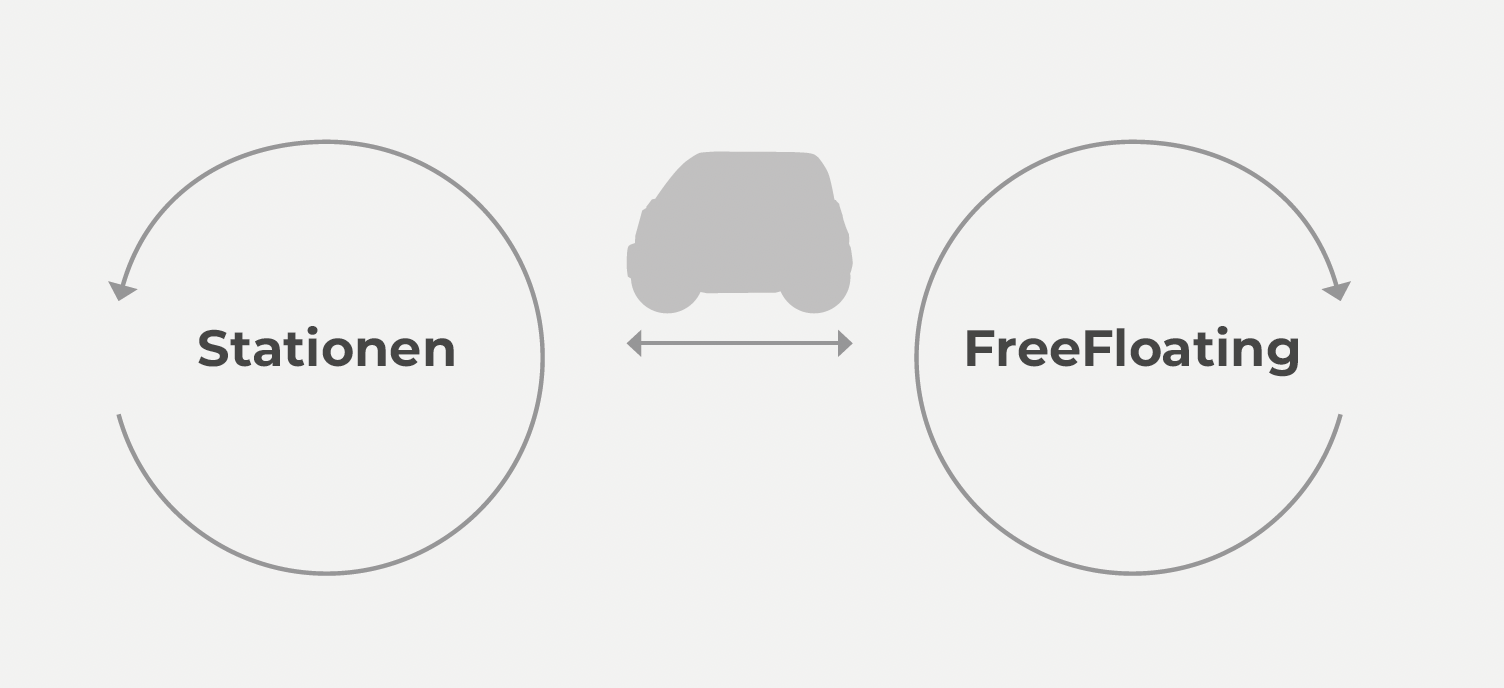 Weiterführend senkt die Einbindung in bestehende Monetarisierungsangebote des ÖPNV die Hürde zur Nutzung des Systems und ebnet den Weg zu einem übergreifend nutzbaren Verkehrsangebot. Die weitere Integration des stationsgebundenen Systems findet über variabel einsetzbare Stationsvarianten statt. Diese Stationen sind durch einen modularen Aufbau an die zur Verfügung stehende Fläche anpassbar und mit Ladeinfrastruktur ausgestattet. Abgerundet wird das Stationsangebot durch ein Free-Floating-Angebot, welches sich in einem definierten Geschäftsgebiet innerhalb der Stadt erstreckt. Die Kombination aus beiden Anbietertypen ermöglicht es dem Nutzer, die Vorteile des zuverlässigen und langfristig planbaren stationsgebundenen Carsharings mit der Flexibilität und Spontanität des Free-Floating-Angebots zu kombinieren.
