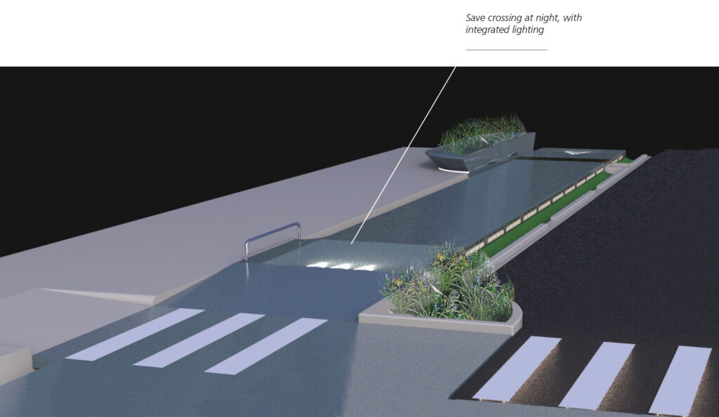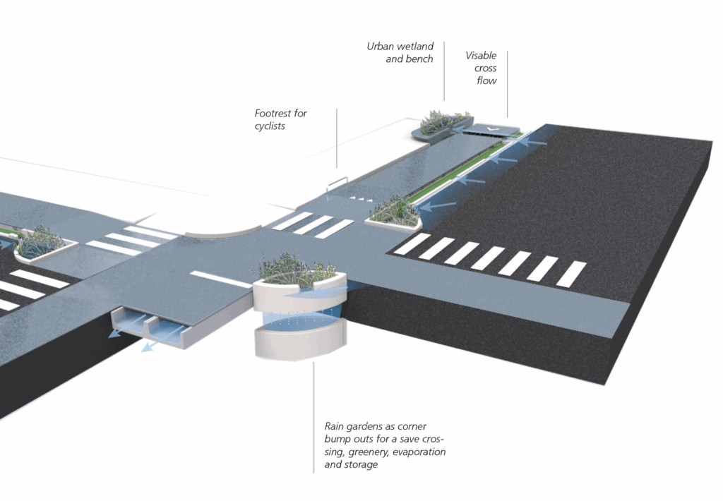 Der Weg ist leicht erhöht, um Sicherheit zu schaffen und Rad- vom Autoverkehr zu trennen. Integrierte Filter entfernen Sand, Öl, Müll und Mikroplastik aus dem abfließenden Wasser. Begrünte Mulden und Bioswales unterstützen die Versickerung und verbessern das Mikroklima. Durchlässige Gehwegplatten mit Pflanzlücken fördern die Begrünung. Ergänzt wird das Konzept durch integrierte Beleuchtung und Sitzbereiche, die den öffentlichen Raum aufwerten und alternative Aufenthaltsqualitäten schaffen.